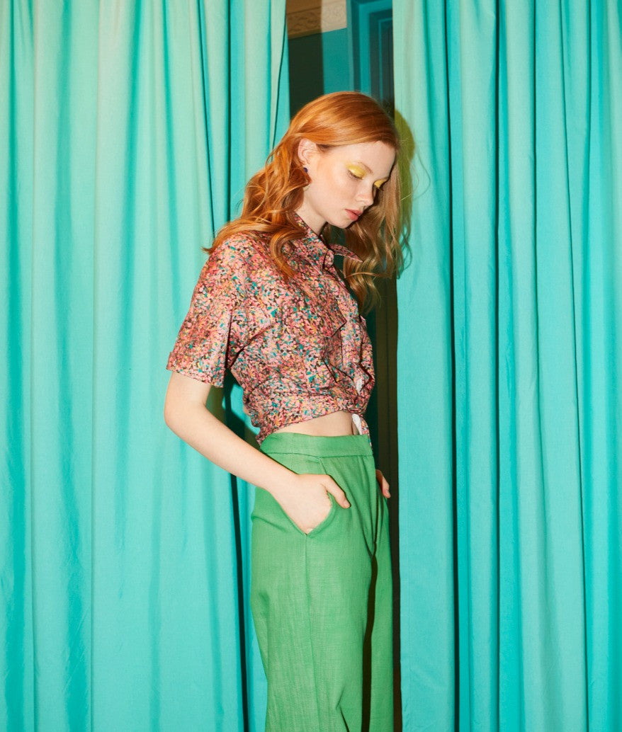 This cropped shirt features a vibrant, multicolored floral pattern on a red/pink base, with accents of blue, green, yellow, and white. The retro-inspired small floral print and 70s/80s aesthetic give it a casual-chic look, perfect for adding a playful touch to your outfit.