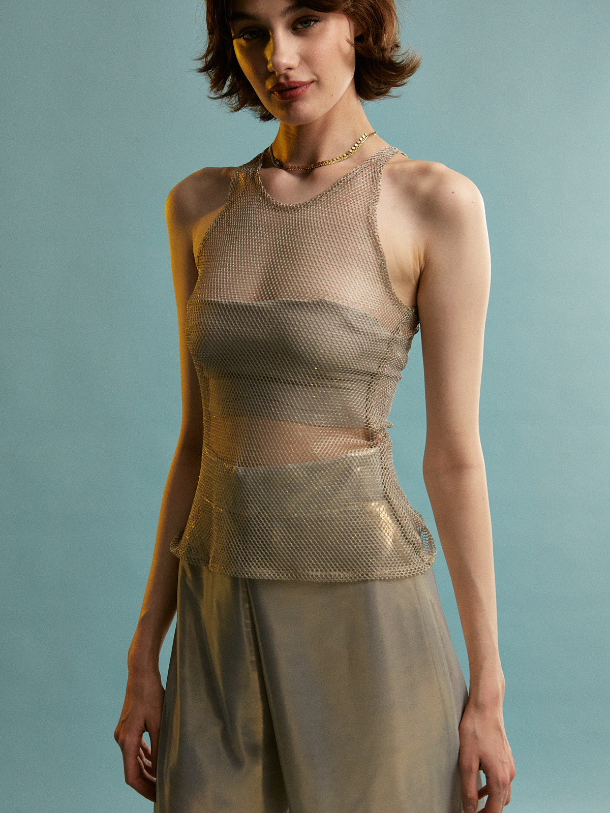 Pair this dress with black high – heeled pumps and a diamond necklace for a classic look. Add a blue clutch to match the mesh top. For a more edgy style, wear it with black leather ankle boots and a statement belt.