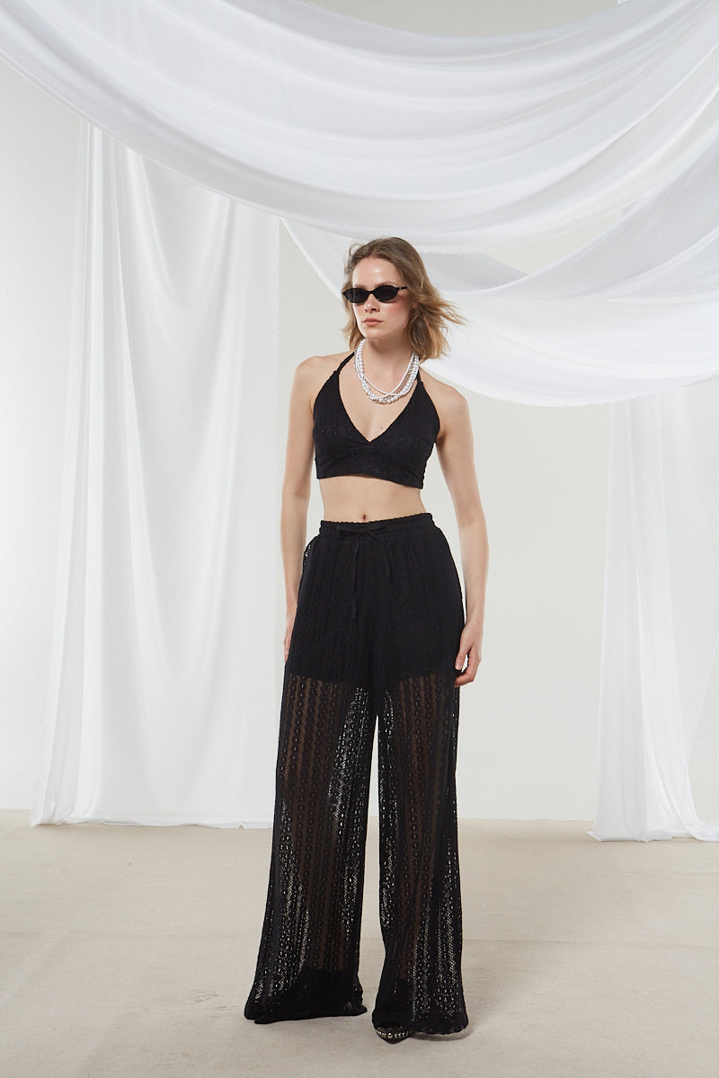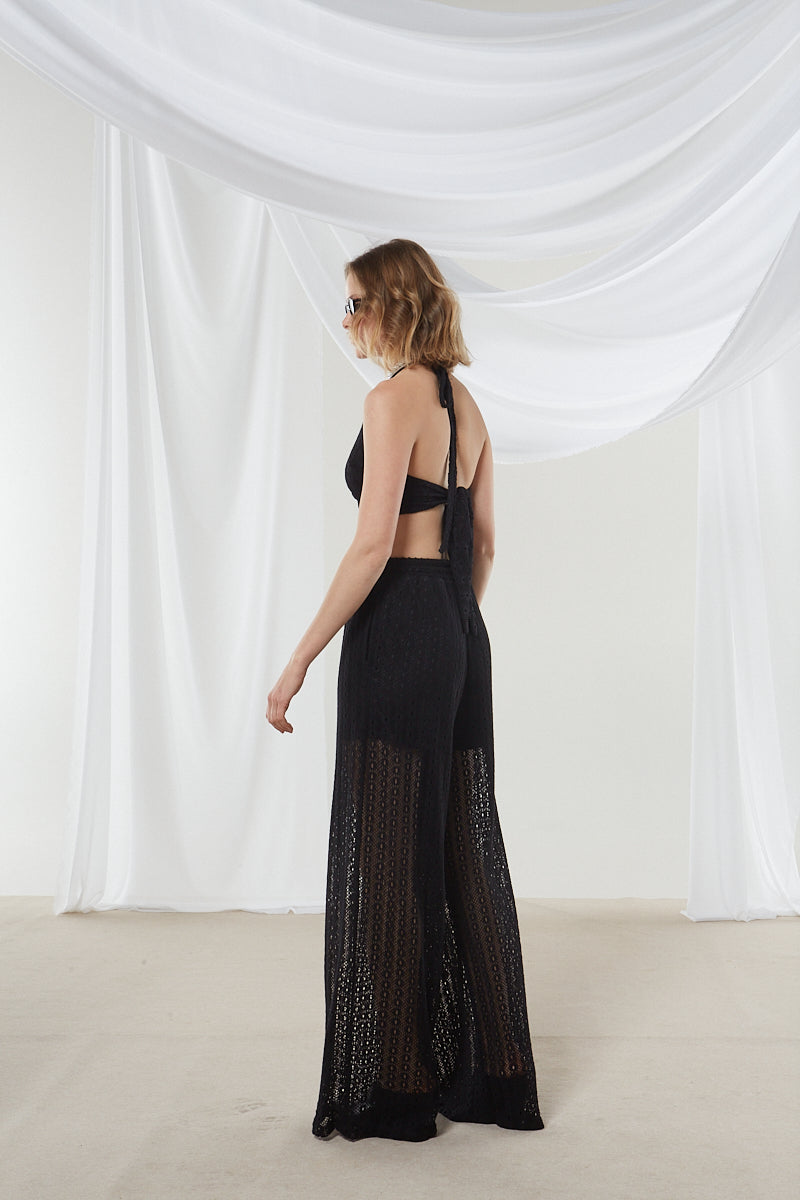 This elegant maxi dress is a stunning choice for formal events. It features a solid black color, with a smooth, stretchy knit upper bodice and a lace-like, open-weave lower half. The halter neckline and midriff cutout add a touch of allure, while the straight, wide-leg flared hemline exudes sophistication.