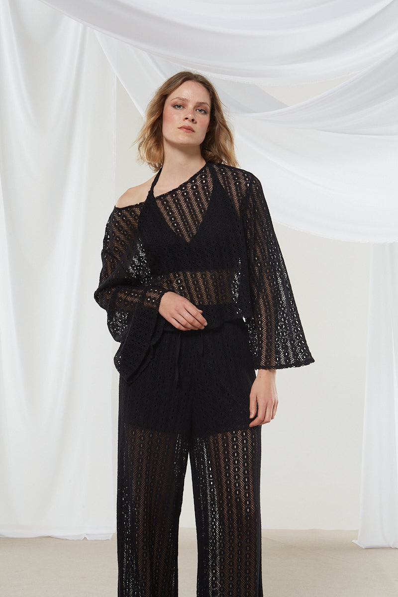 - Color & Pattern: Solid black with a textured open-weave pattern on the lower half