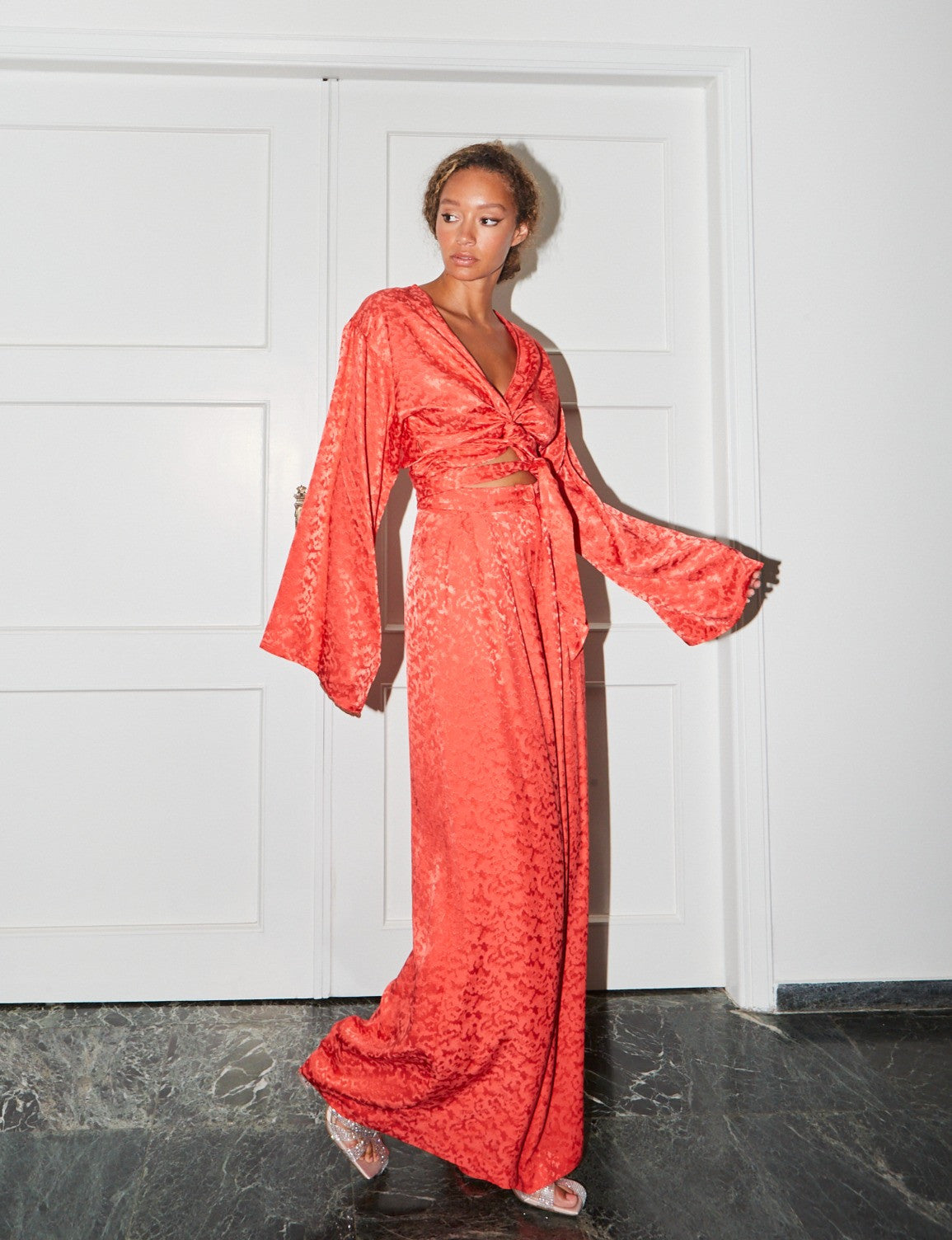 • Color & Pattern: Main color is vibrant red – orange (coral – red), with a subtle textured jacquard or abstract floral pattern.