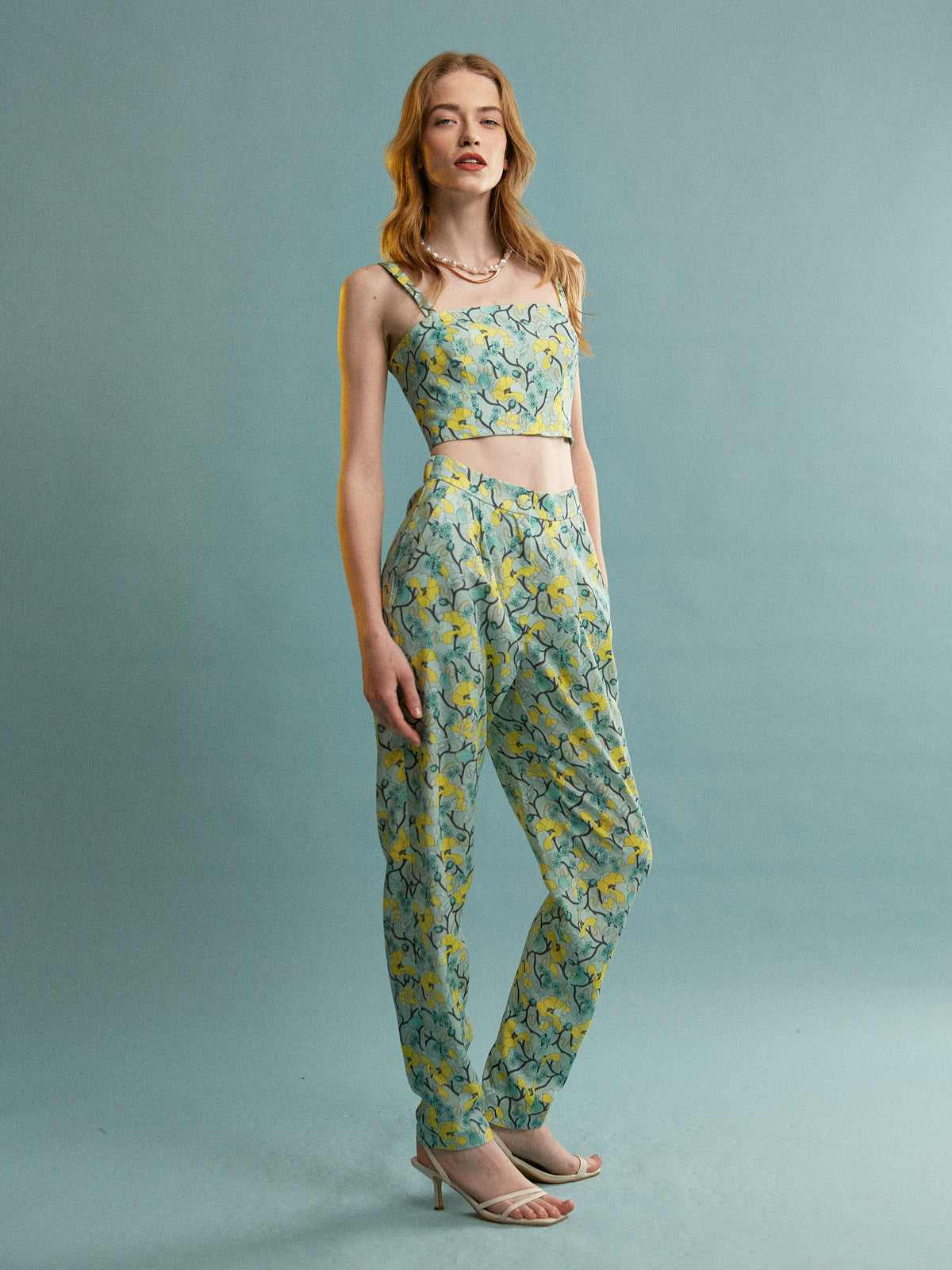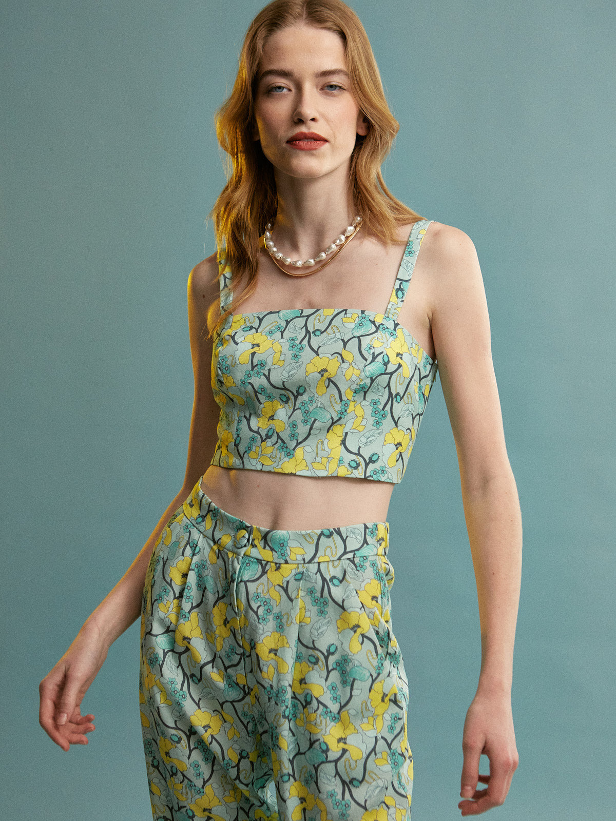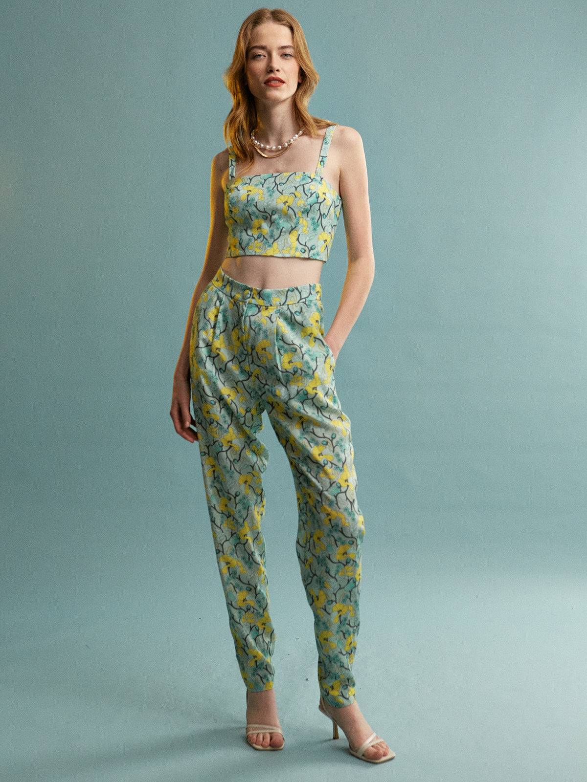 This is a coordinated two – piece set featuring a crop top and high – waisted trousers. The light turquoise base is adorned with a bright yellow floral print, complemented by dark green and black foliage, creating a fresh and summery look.