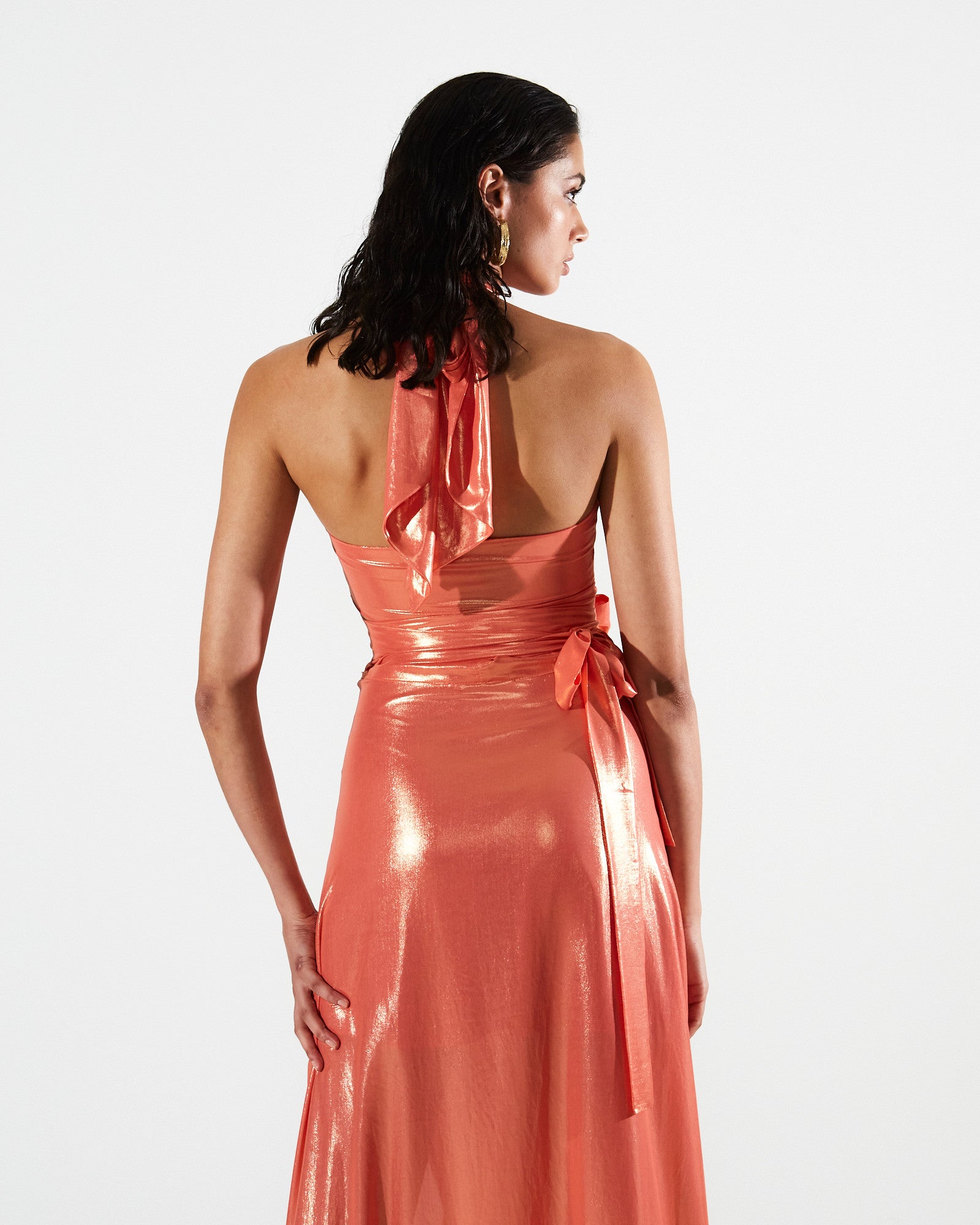 Make a statement with this glamorous maxi dress featuring a cropped halter top and a straight floor-length skirt. The shiny coral color with a metallic finish is eye-catching, and the bodycon fit accentuates your curves elegantly. It’s perfect for formal events and parties, exuding a sophisticated and retro-glam vibe.