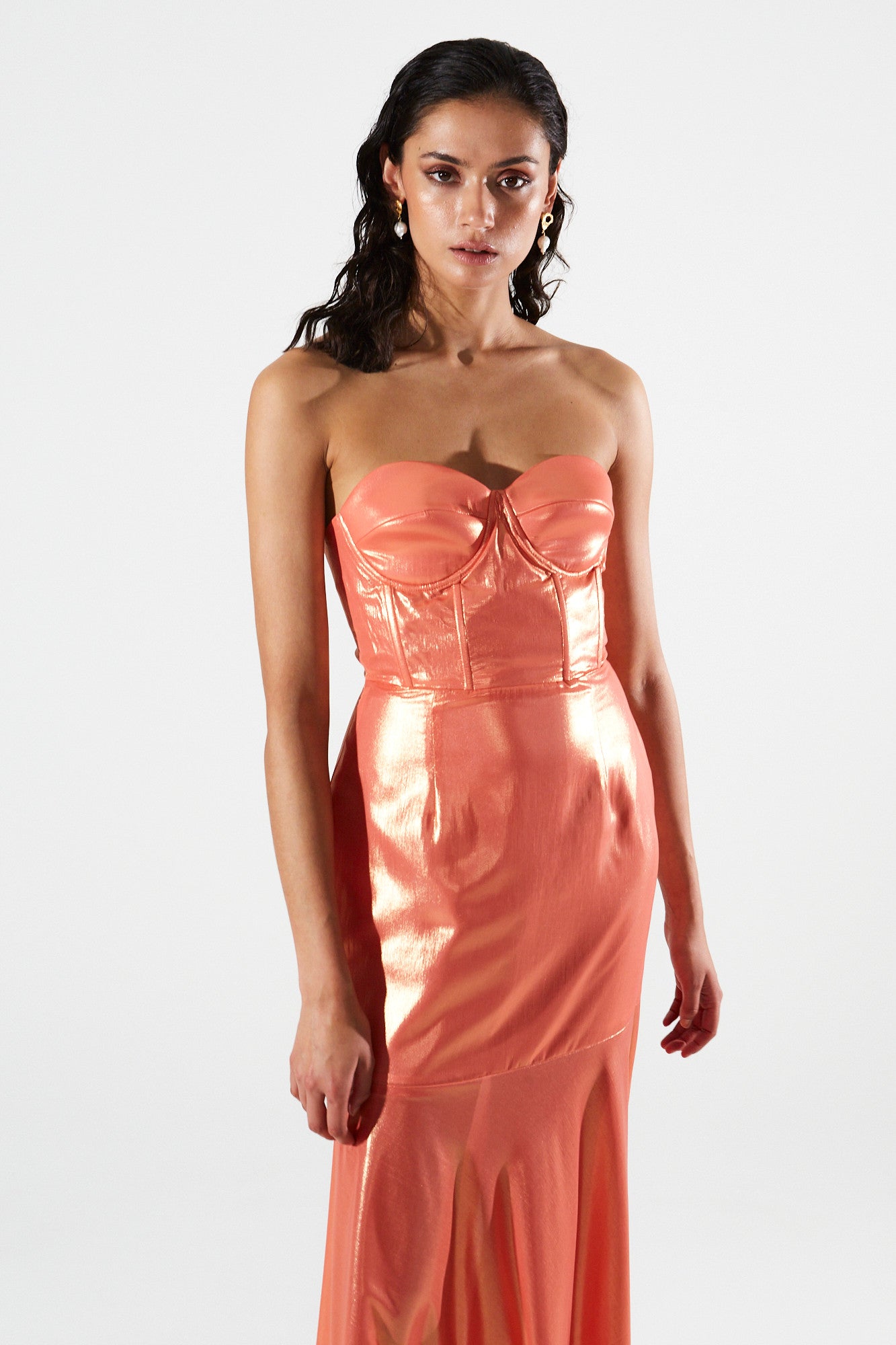 Step into the spotlight with this stunning maxi dress. It features a vibrant coral color with a metallic sheen and a solid pattern, exuding sophistication and glamour. The structured corset-style bodice and flowing mermaid skirt create a dramatic and elegant silhouette.