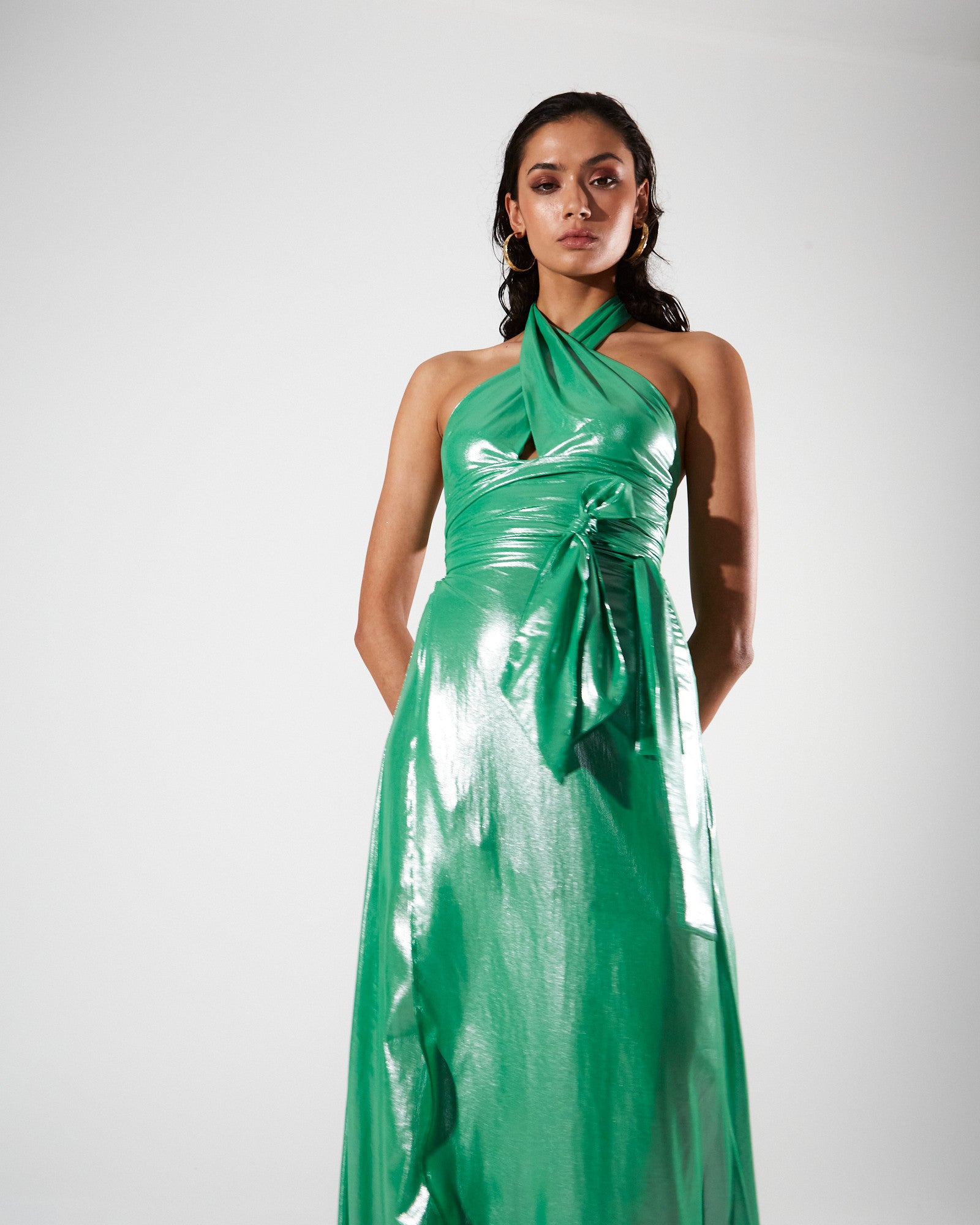 Make a bold statement with this stunning metallic green maxi dress. Its solid color and shiny satin finish exude elegance, while the halter neck with a keyhole cutout adds a touch of allure. The asymmetric hem and waist sash create a dynamic and sophisticated look, perfect for formal events.