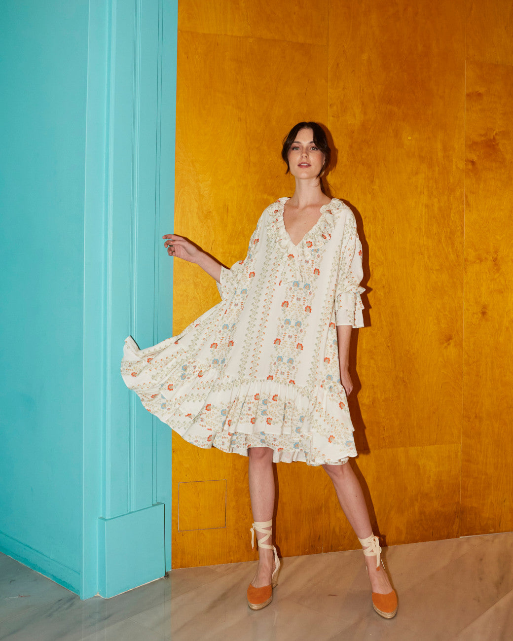 - Design features: Deep V-neck with ruffled trim, short flared sleeves with ruffled cuffs, A-line tiered ruffled hemline, and prominent ruffled accents throughout.