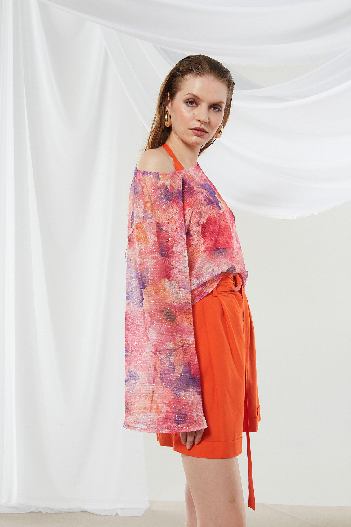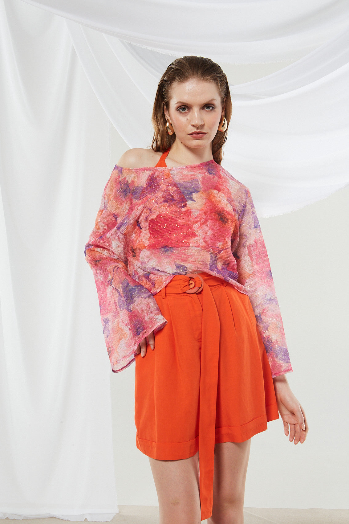 - Fabric characteristics: The floral bodice is made from a semi – sheer, lightweight knit/woven blend with a subtle textured finish. The orange skirt is crafted from a structured crepe/cotton blend with a smooth, matte texture.