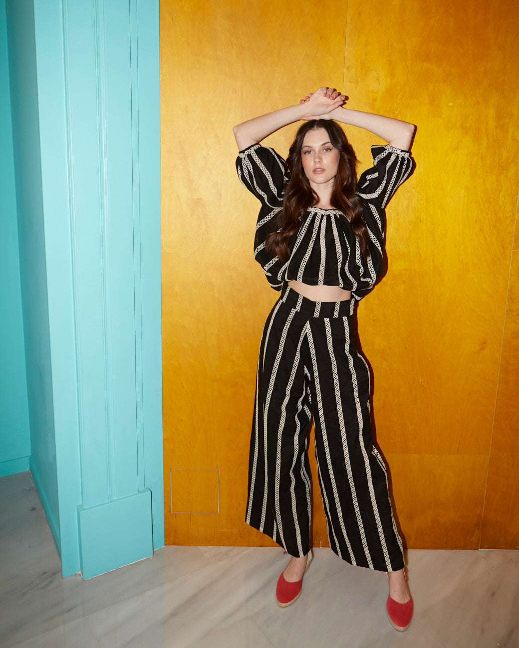 - Craftsmanship details: The structured silhouette holds the puffed sleeve shape well, and the vertical stripes are well – aligned between the top and pants.
