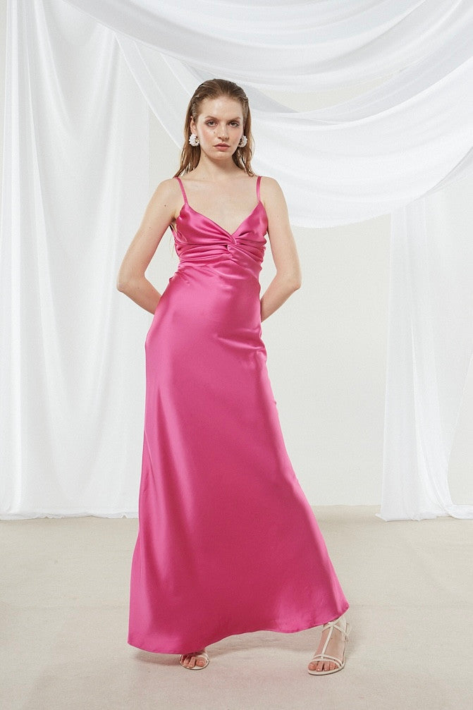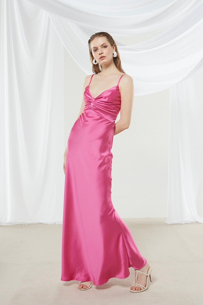 - Design features: Deep V – neck, spaghetti straps (sleeveless), straight floor – length hemline, and a ruched/twisted bodice detail at the bust.