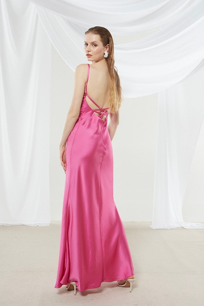 Make a bold statement with this formal maxi dress. It comes in a vibrant hot pink/magenta solid color, crafted from shiny satin fabric. The ruched bodice and form – fitting column silhouette add a touch of glamour and elegance, making it perfect for formal evenings.
