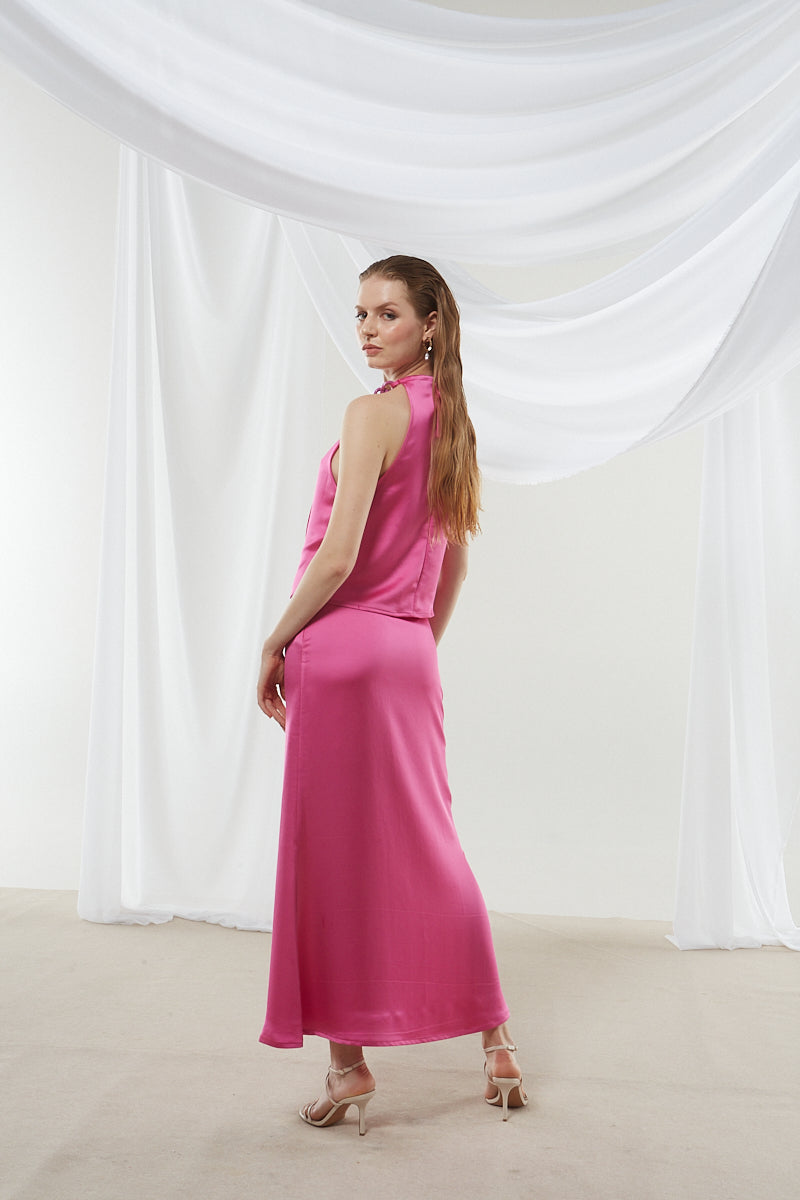 Step into elegance with this vibrant magenta midi dress. Crafted from lustrous satin, it features a solid color design that exudes sophistication. The halter neck with a central bow knot and decorative trim adds a touch of glamour to this formal ensemble.
