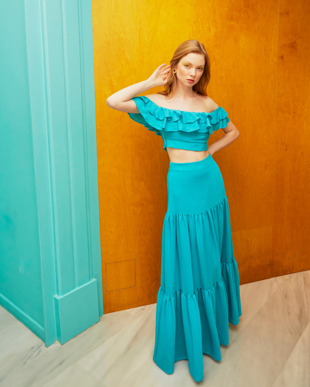 This stunning maxi dress is a two-piece ensemble featuring a vivid turquoise color. The off-the-shoulder cropped top with ruffled trim and the tiered ruffled maxi skirt create an elegant and vintage-inspired look, perfect for formal events.