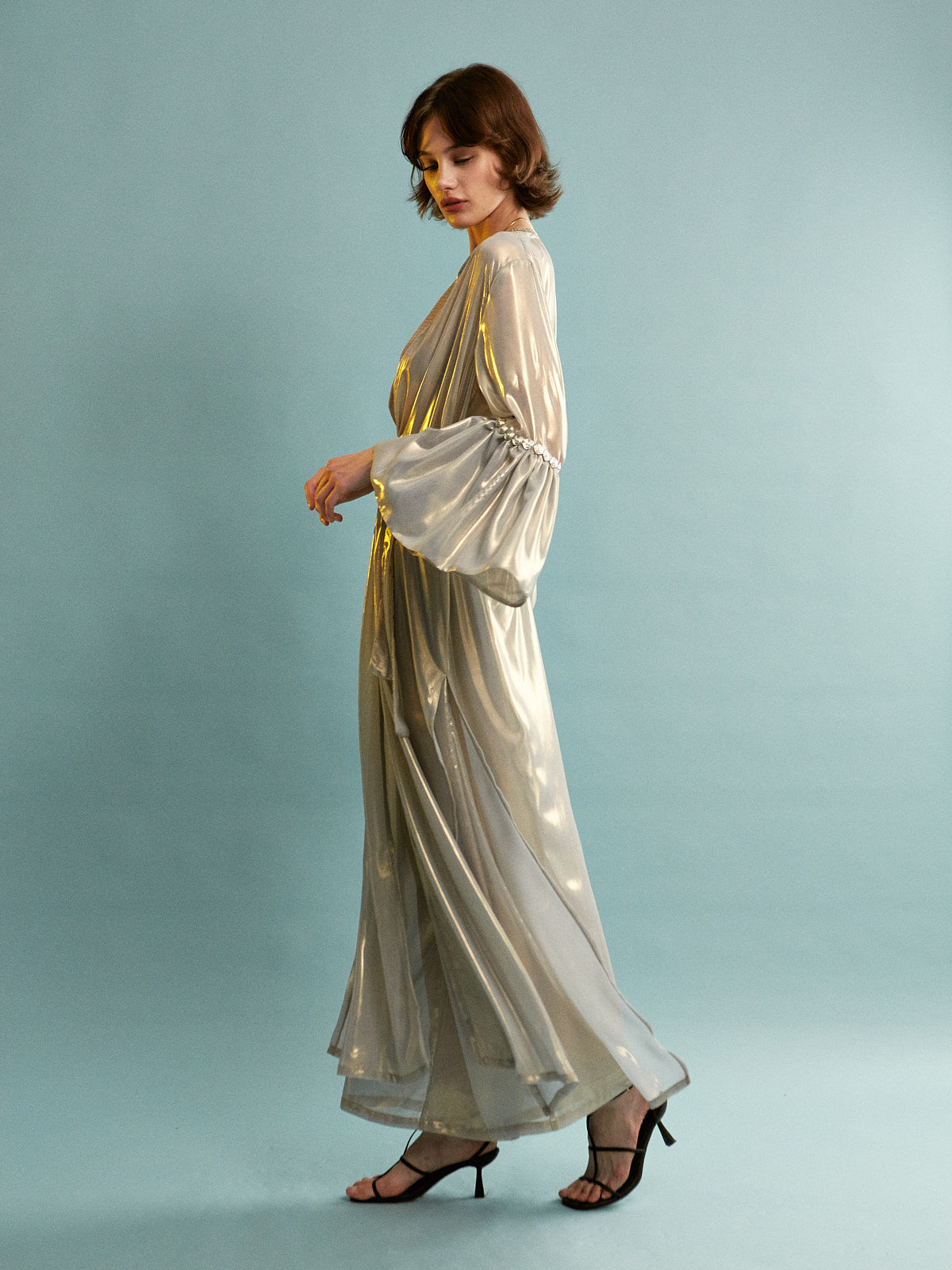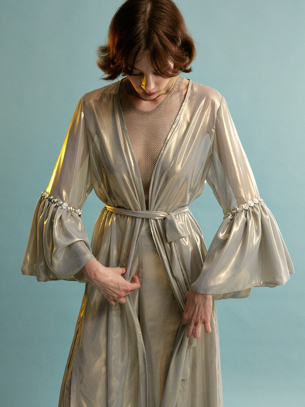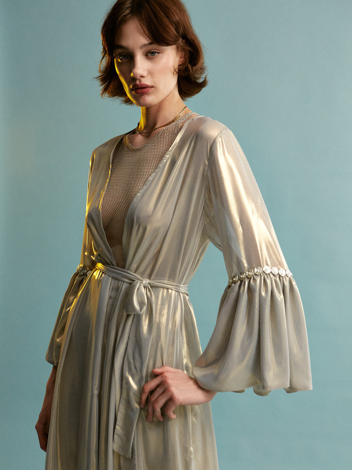 • Fabric characteristics: Made from a metallic-sheen satin or silk-blend with a smooth, glossy texture and a structured yet flowing drape. The sheer, lightweight mesh insert adds transparency and contrast.