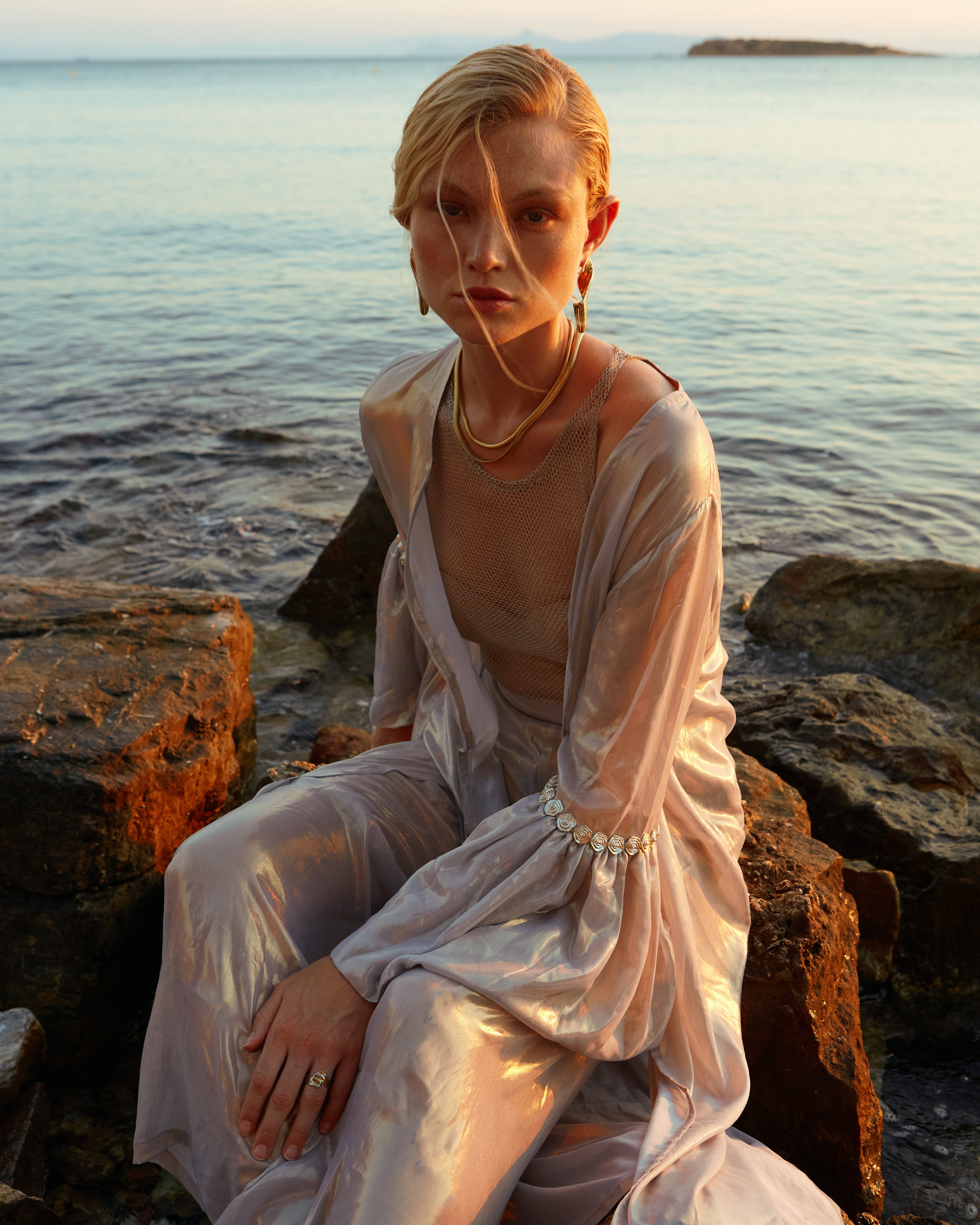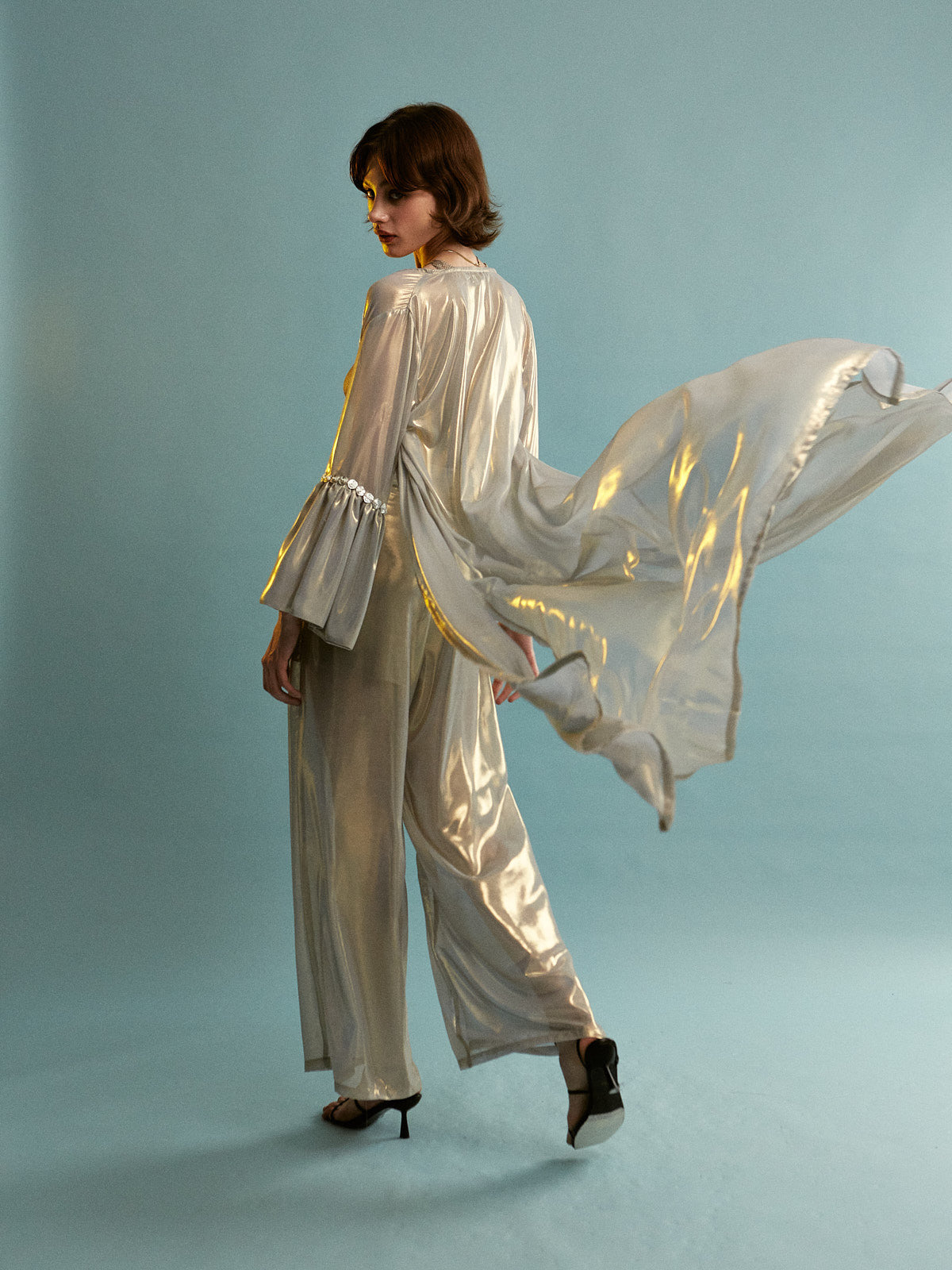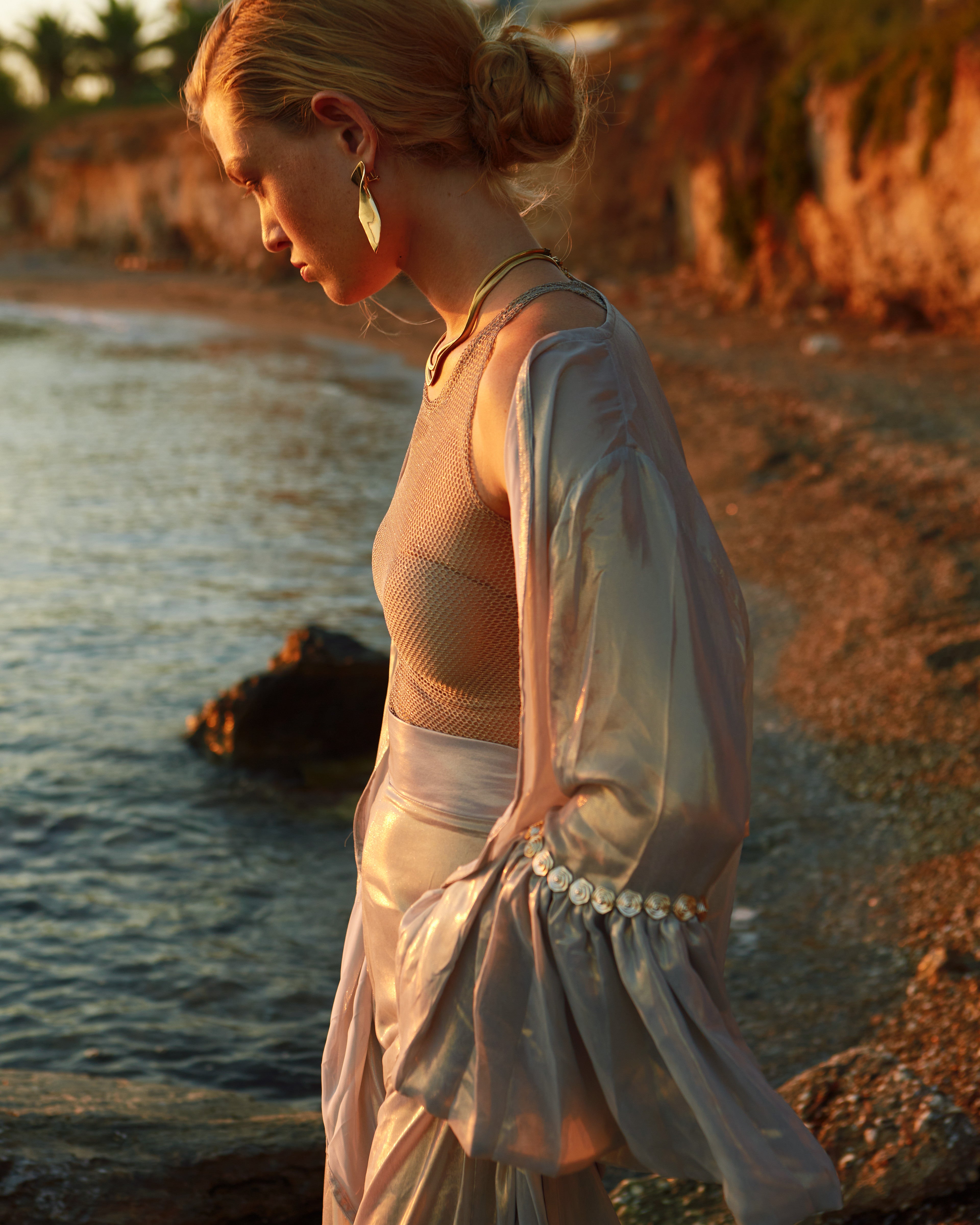 • Fabric characteristics: Made from a metallic-sheen satin or silk-blend with a smooth, glossy texture and a structured yet flowing drape. The sheer, lightweight mesh insert adds transparency and contrast.