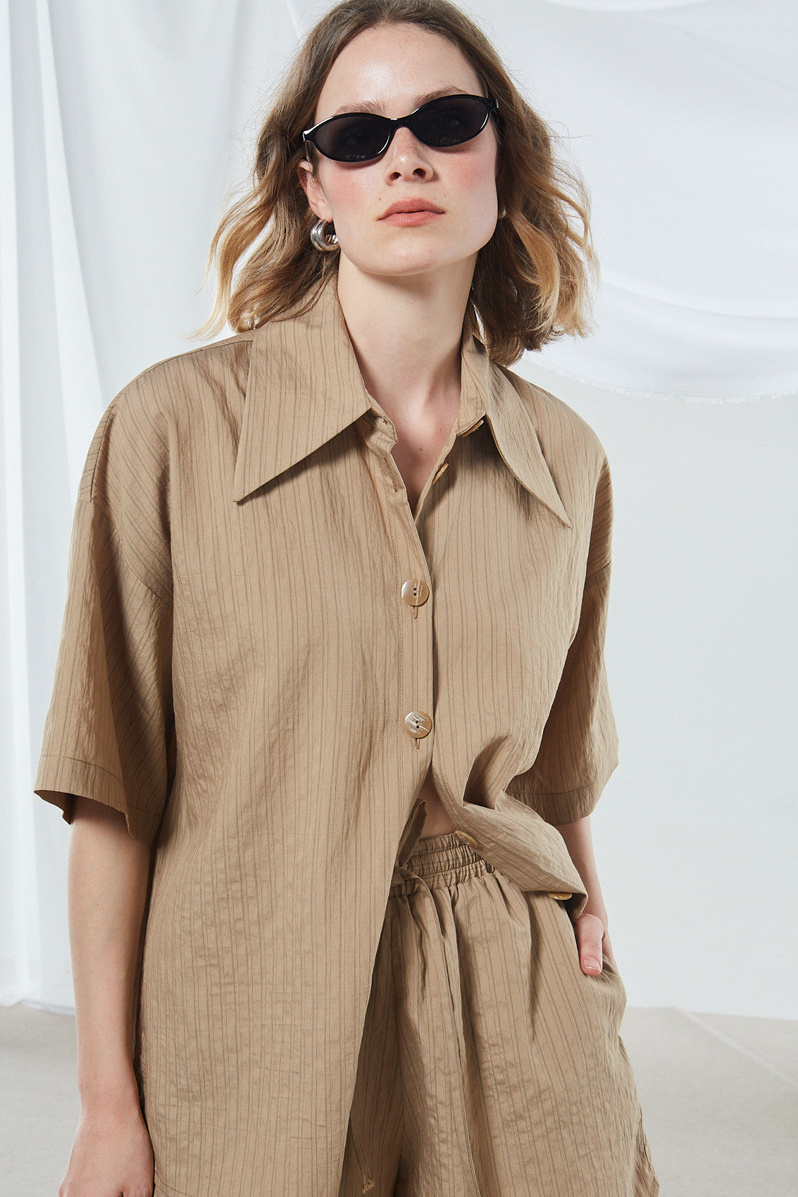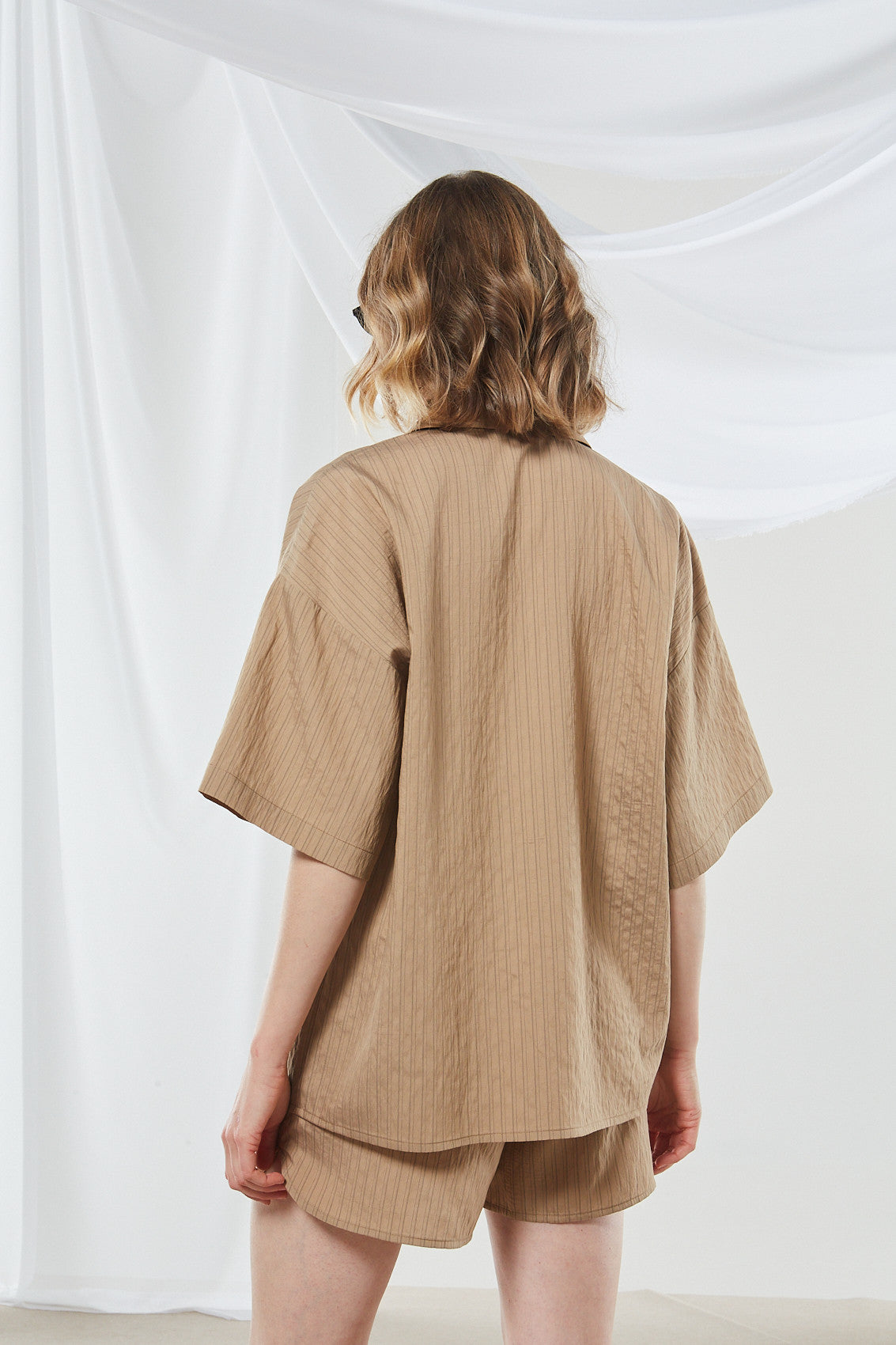 This mini dress combines an oversized shirt with matching shorts, creating a unique shirt – dress or playsuit style. It features a light brown/beige color with fine vertical pinstripes, offering a casual, minimalist, and modern aesthetic.
