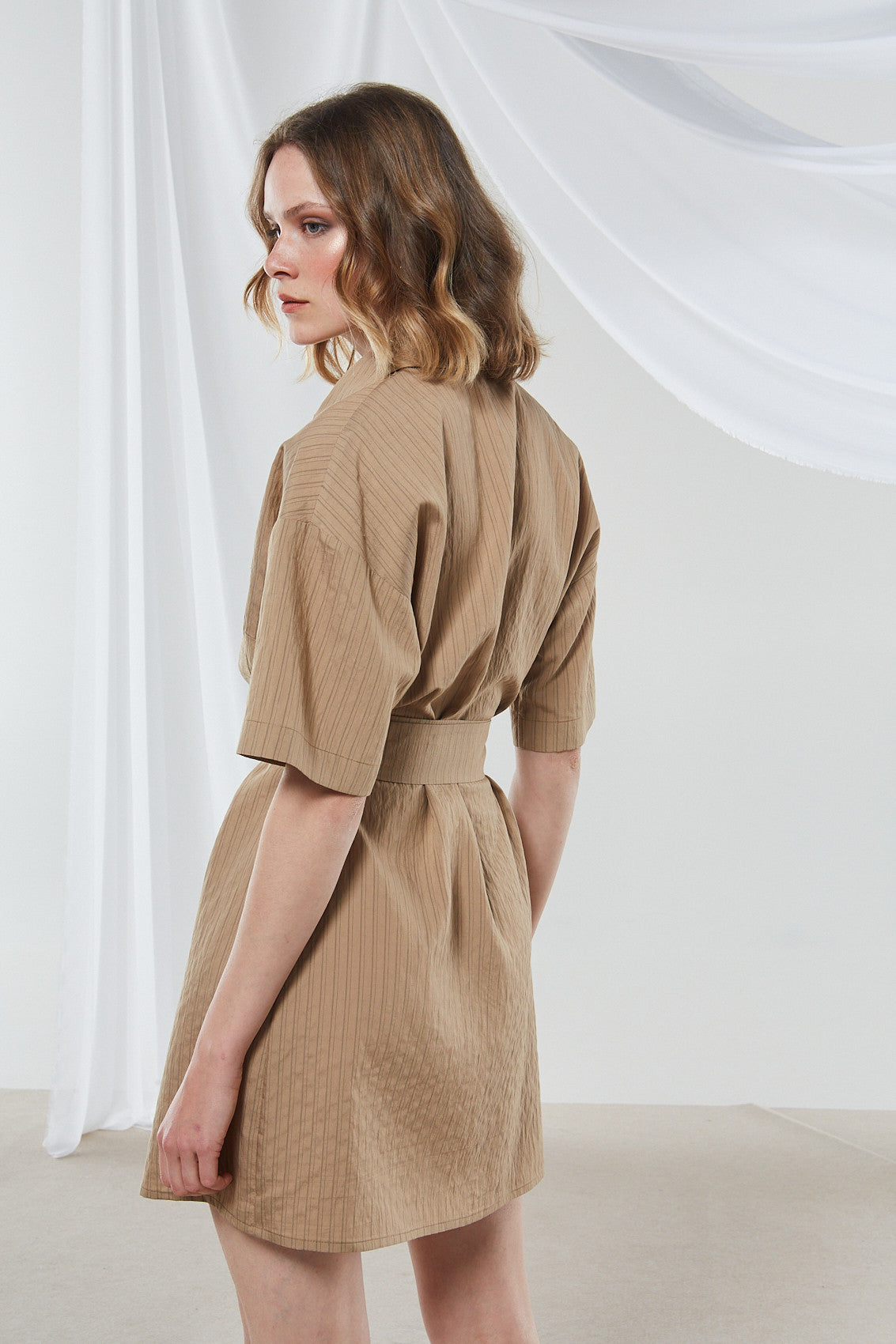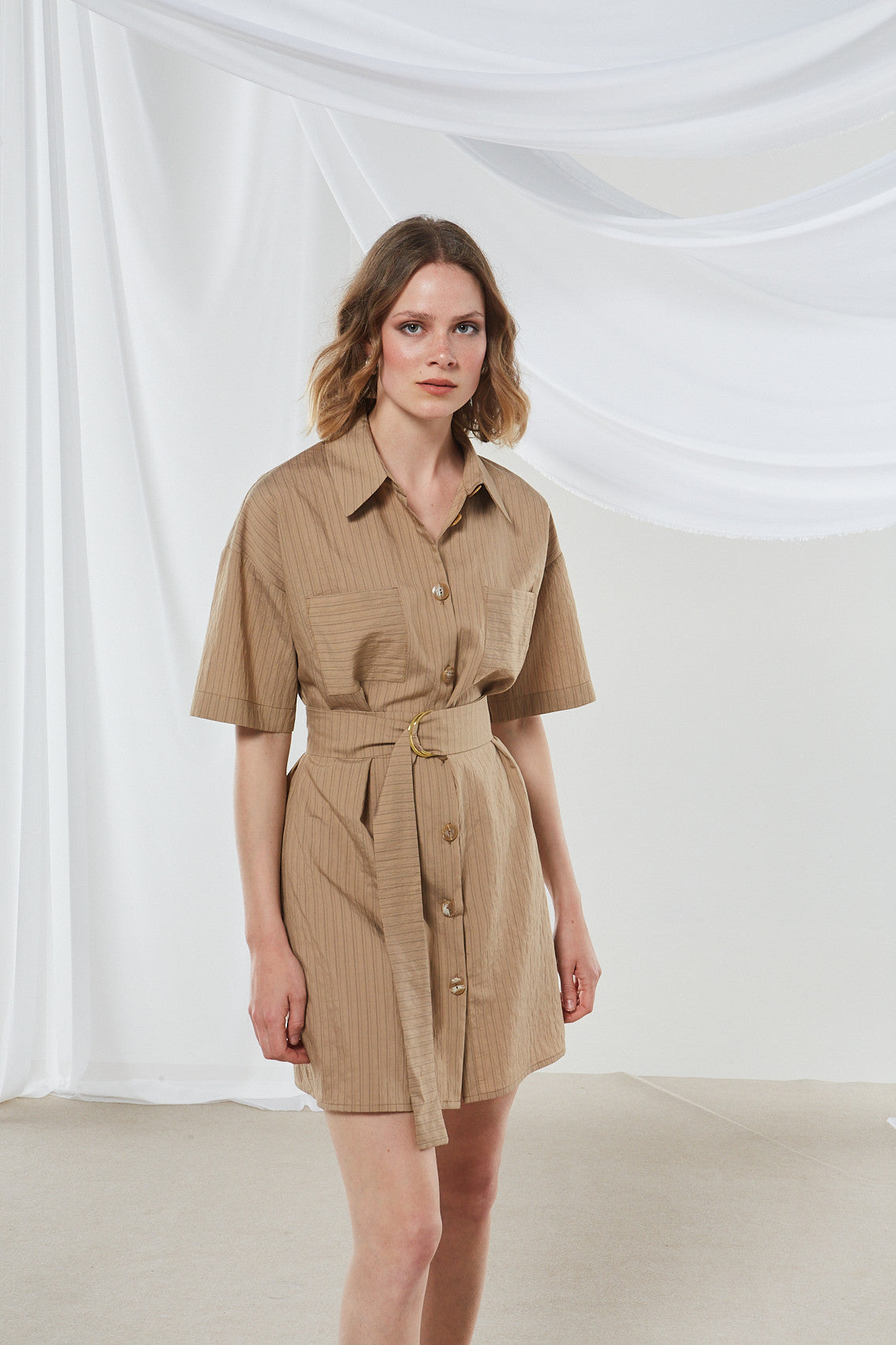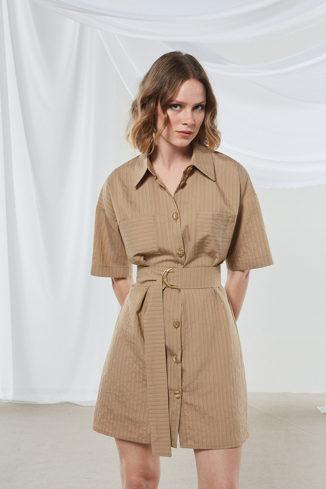 This stylish mini shirtdress features a light tan base with vertical fine stripes, presenting a minimalist and sophisticated look. It is crafted from cotton poplin, providing a smooth, matte finish with a subtle sheen. The belted waist adds a touch of refinement to its overall smart-casual style.