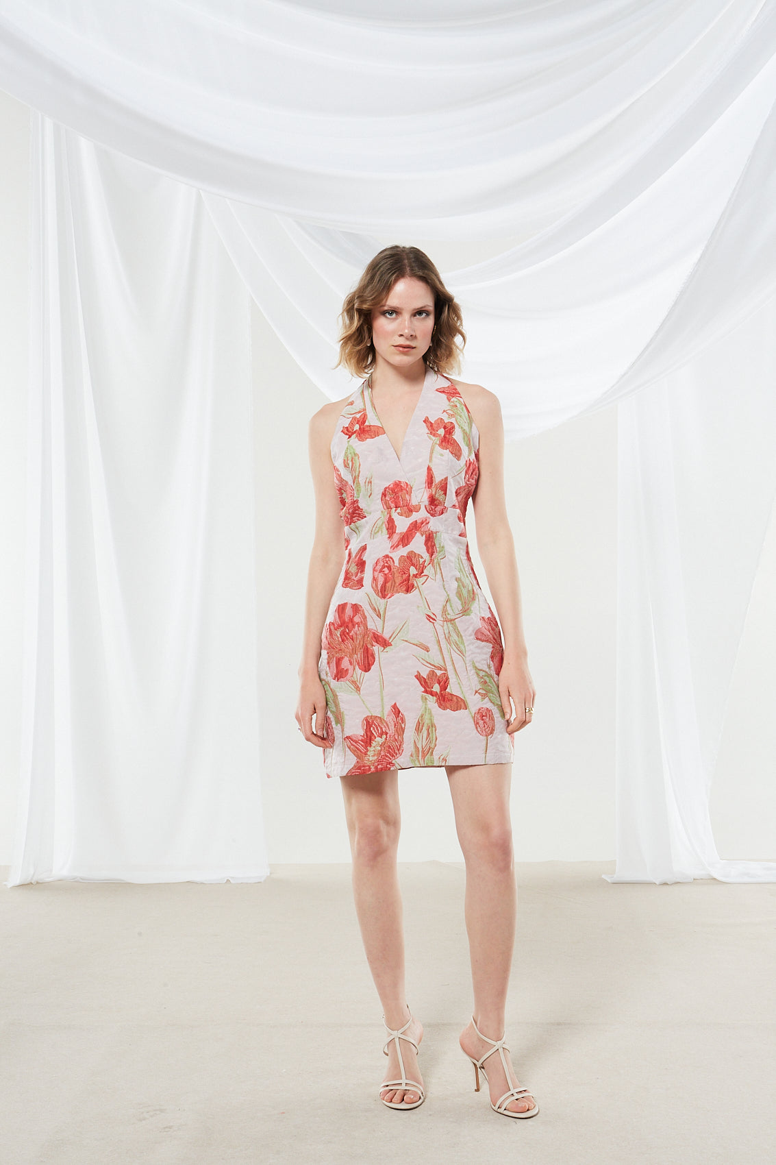This elegant mini dress features a light neutral base with subtle pink undertones, adorned with large, stylized red flowers and green leaves. The halter-style V-neck and bodycon fit give it a feminine and retro-inspired look, perfect for summer gatherings.