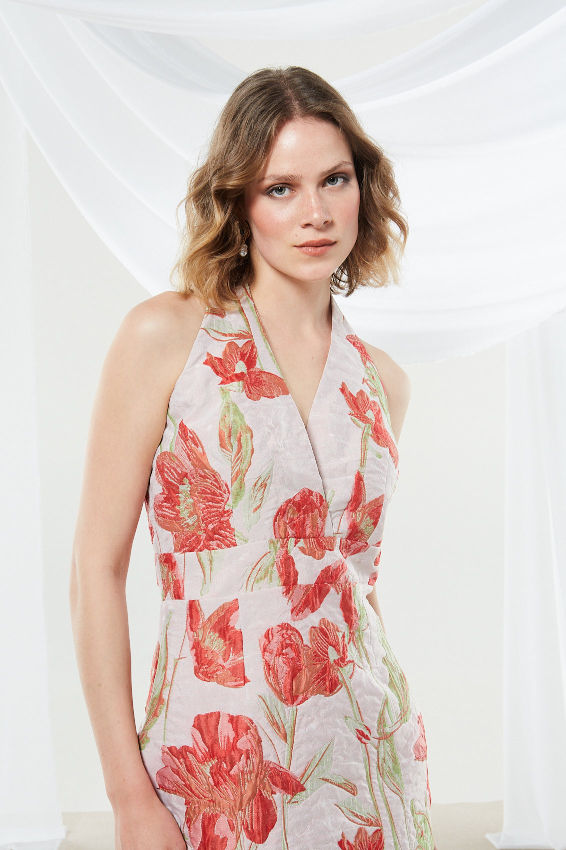 - Design features: Halter-style deep V-neck, sleeveless, straight hemline, halter-neck wrap style