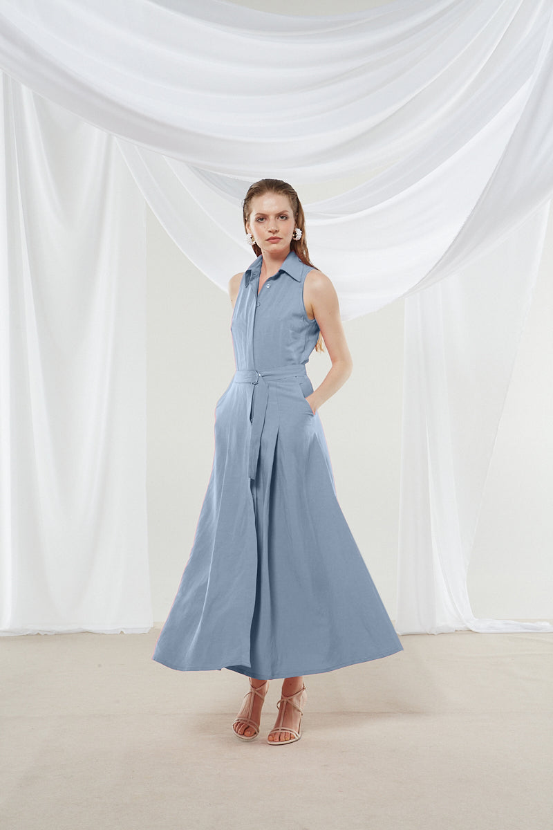 - Design features: Structured notched lapel/collar neckline, sleeveless design, A-line hemline, structured waist, and a front placket/closure with subtle buttoning or wrap detail.