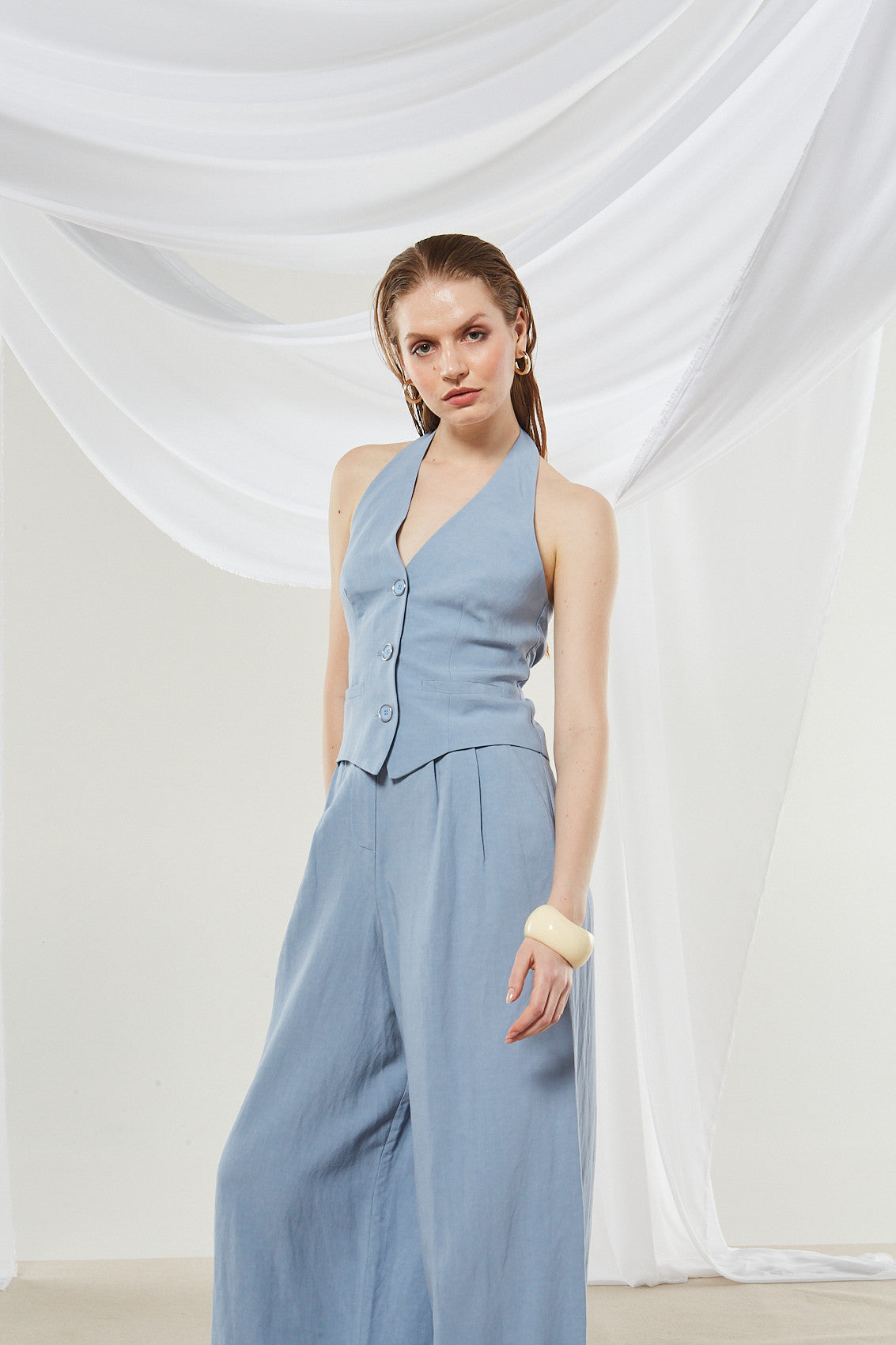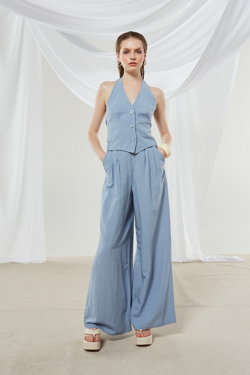 - Design features: Halter neck with a deep V – neck front, sleeveless, straight hemline at the top waist with a slight taper to the front and a button placket, wide – leg straight floor – length pants, three buttons down the front of the top as a functional closure, high waist with pleats