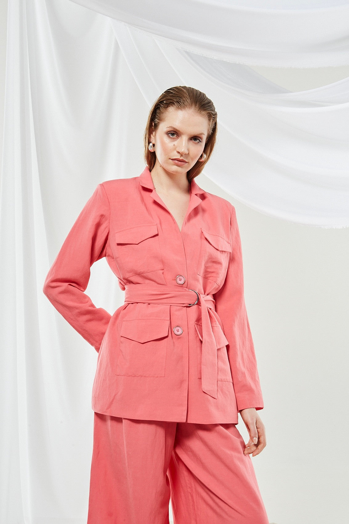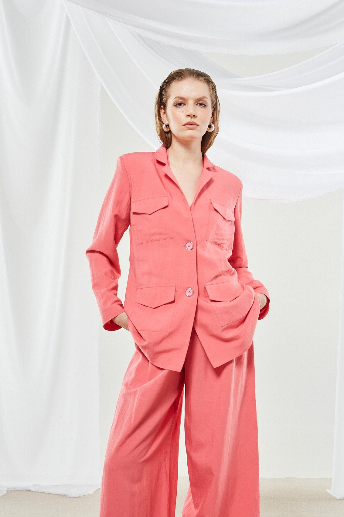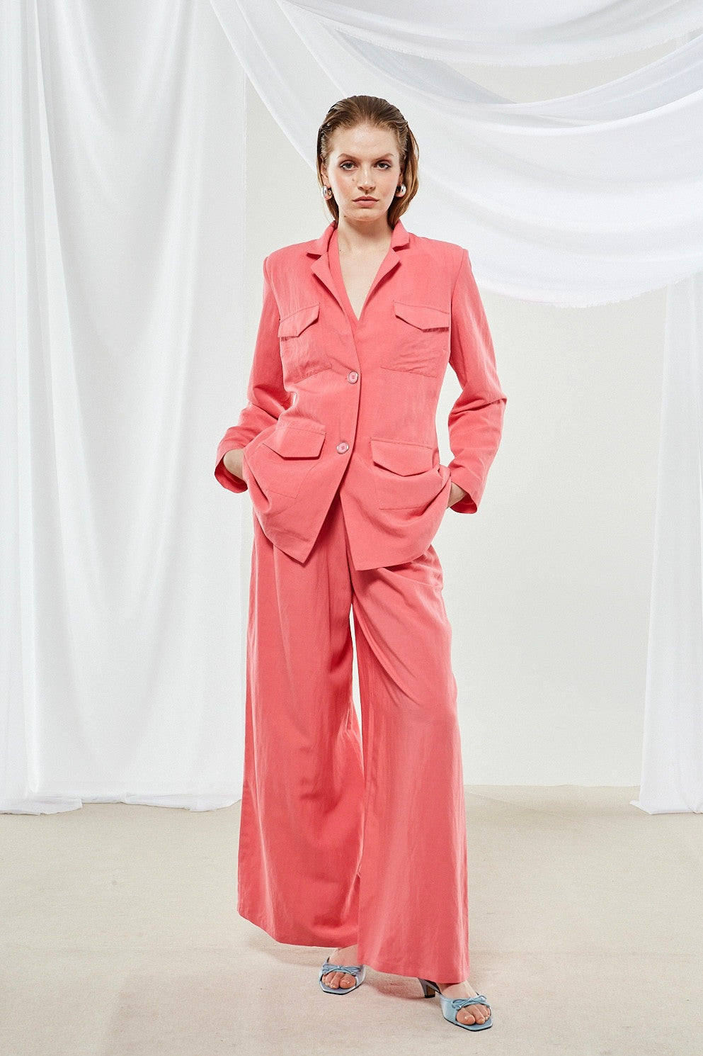 Introducing a sophisticated tailored suit in a vibrant coral pink color. The set includes a cropped blazer with a straight hem and wide-leg trousers that flow to the floor. The solid color and structured design make it a modern and professional choice.