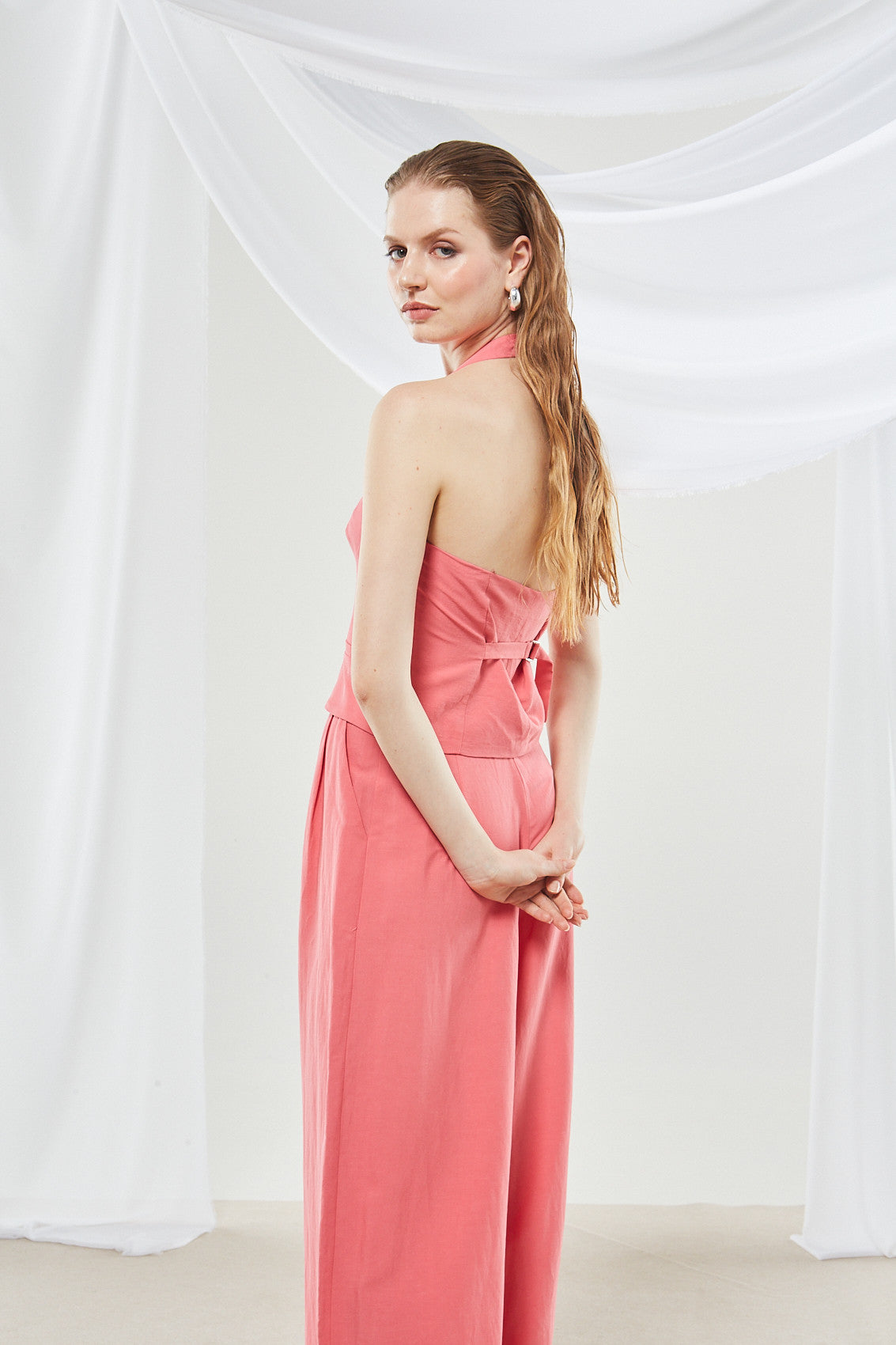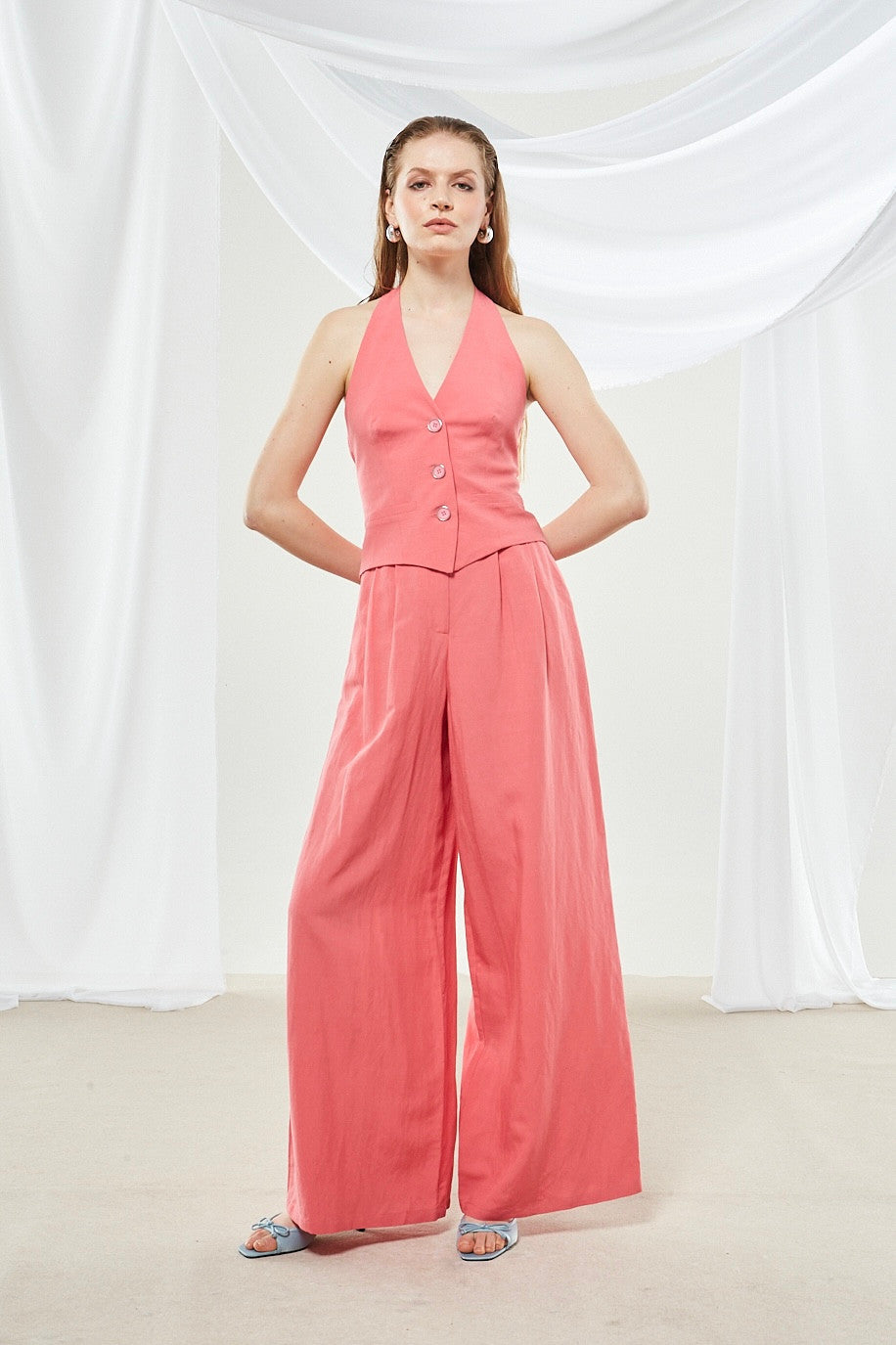 Make a sophisticated statement with this elegant maxi dress. It comes in a solid coral/pink color, exuding a bright and warm peach-coral hue. The tailored bodice and wide-leg skirt create a balanced and structured silhouette, perfect for various elegant occasions.