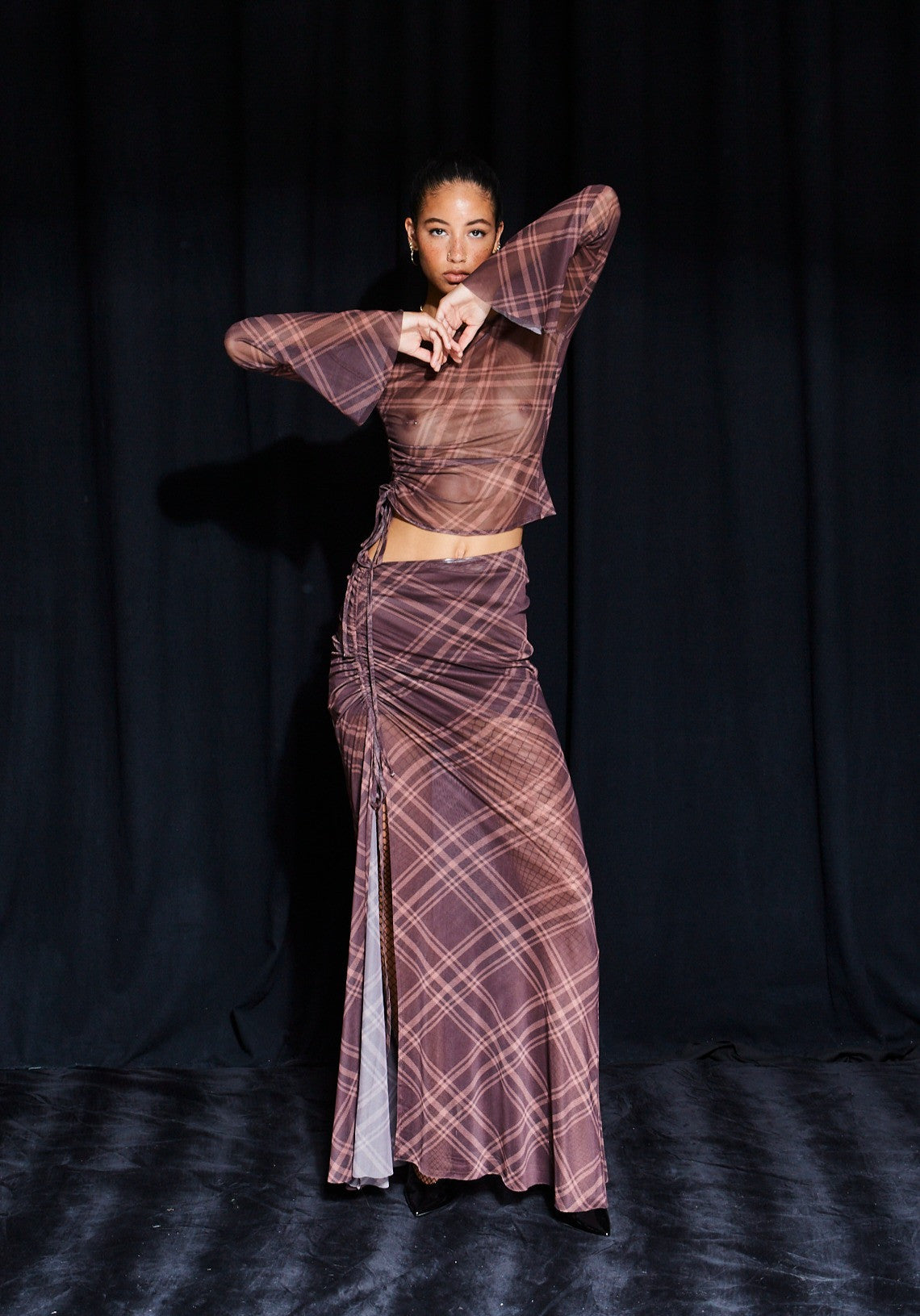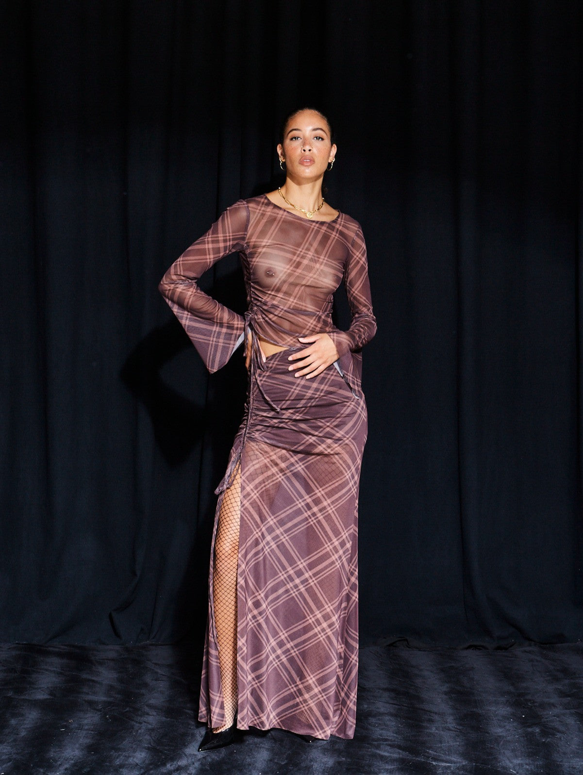 Make a bold statement with this avant-garde maxi dress. It features a rich plum/mauve base with a plaid pattern in a lighter pinkish-beige hue, creating a striking contrast. The semi-sheer mesh fabric adds a touch of edgy sensuality, making it perfect for high-fashion events.