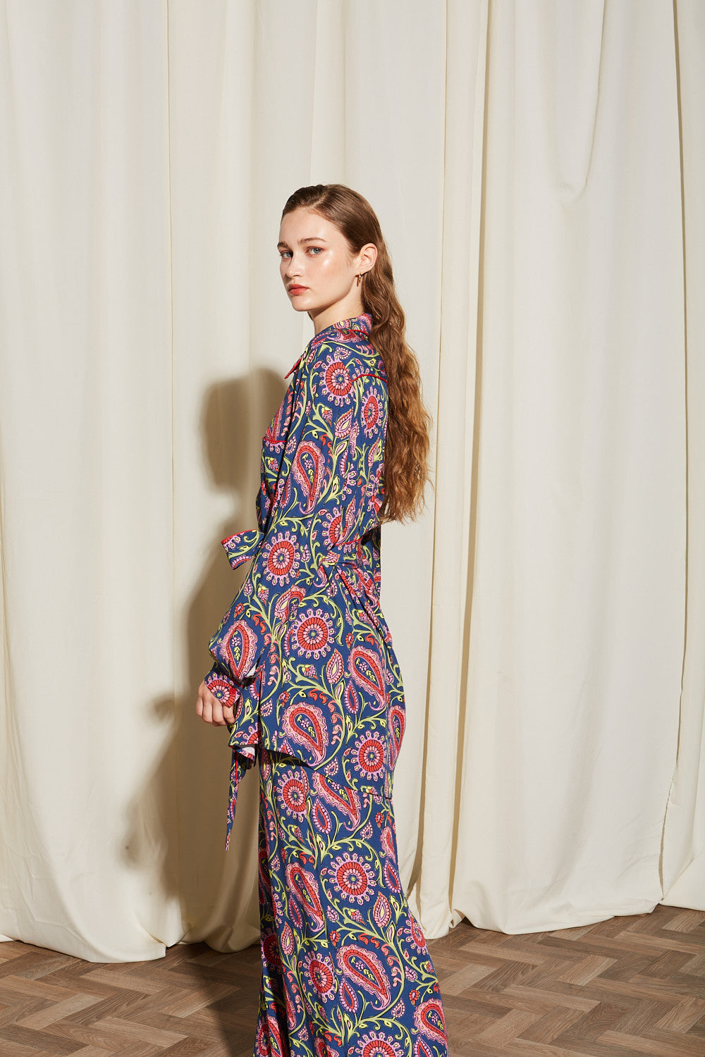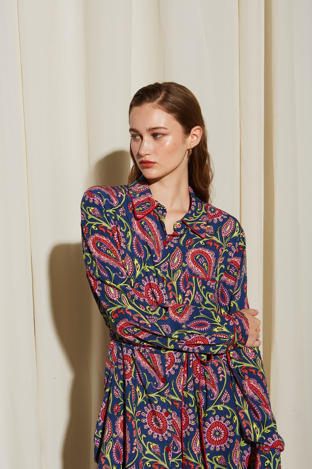This maxi dress exudes a bohemian – chic style with its deep navy blue base and vibrant paisley pattern featuring red/pink, green, and yellow/white accents. The shirt – dress silhouette, combined with a self – tie belt at the waist, offers a perfect blend of vintage charm and modern elegance.