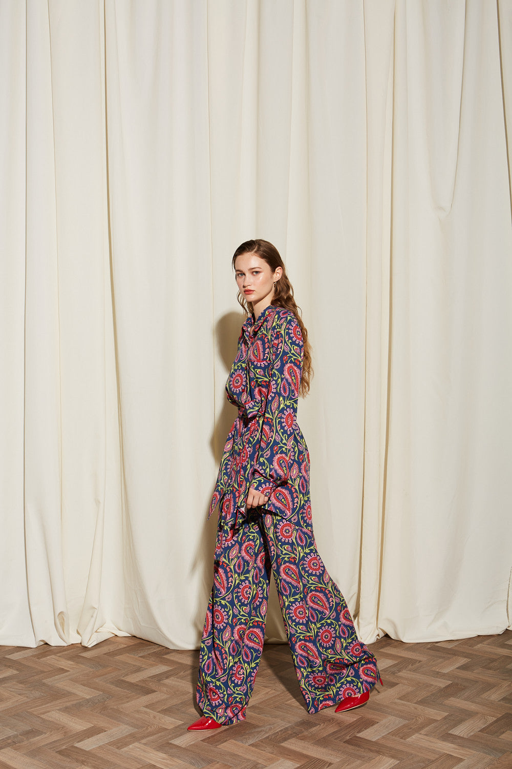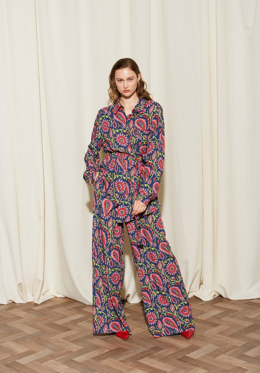 - Color & Pattern: Deep navy blue base with a paisley pattern in red/pink, green, and yellow/white accents.