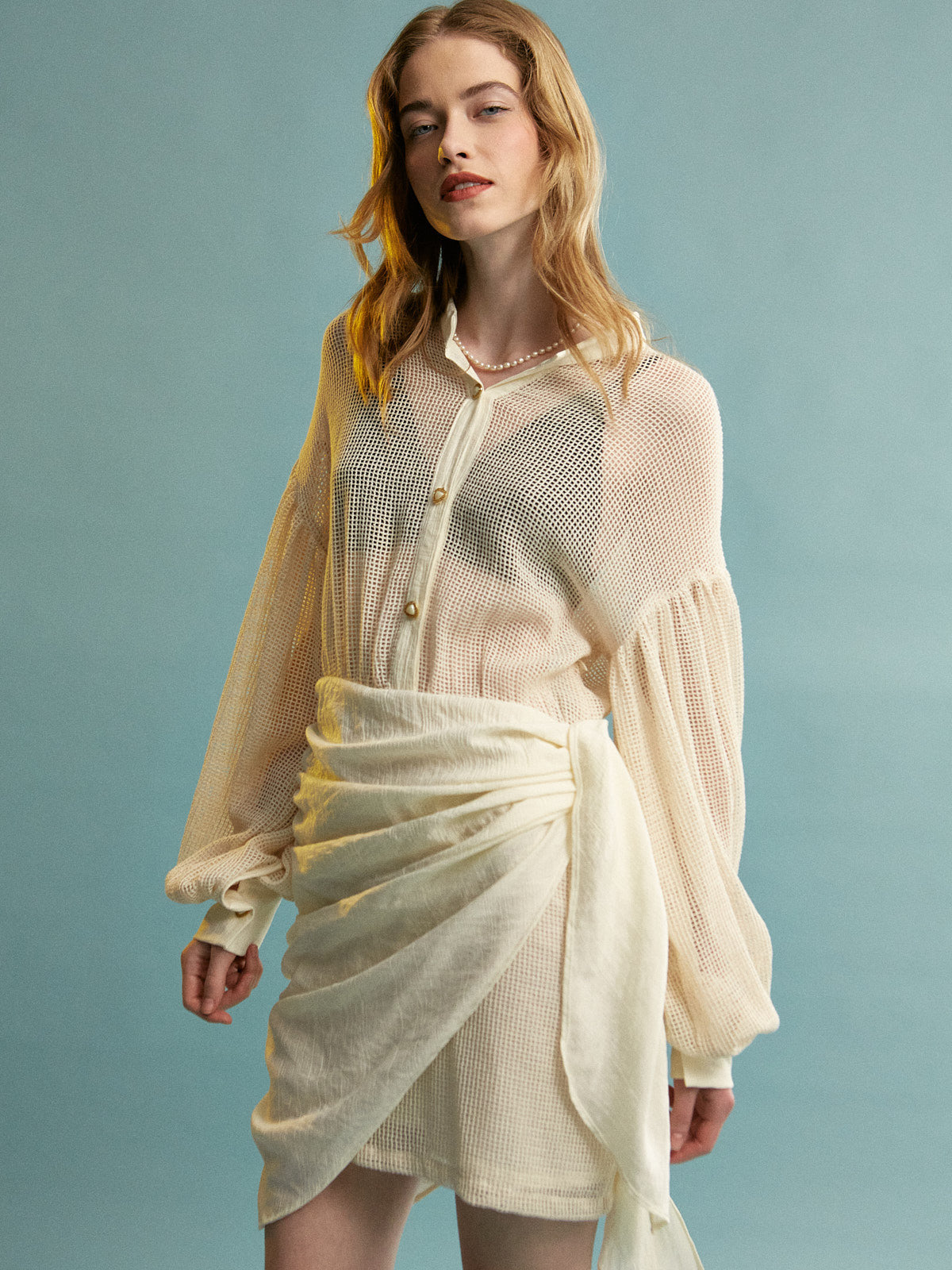 - Design features: Collared neckline with a button – front closure, long blouson sleeves, straight hem on the mesh fabric with an asymmetric, gathered texture at the draped waist. It also has gold or cream – toned buttons, open – knit mesh construction on the bodice, and a draped, wrapped fabric tied at the waist.