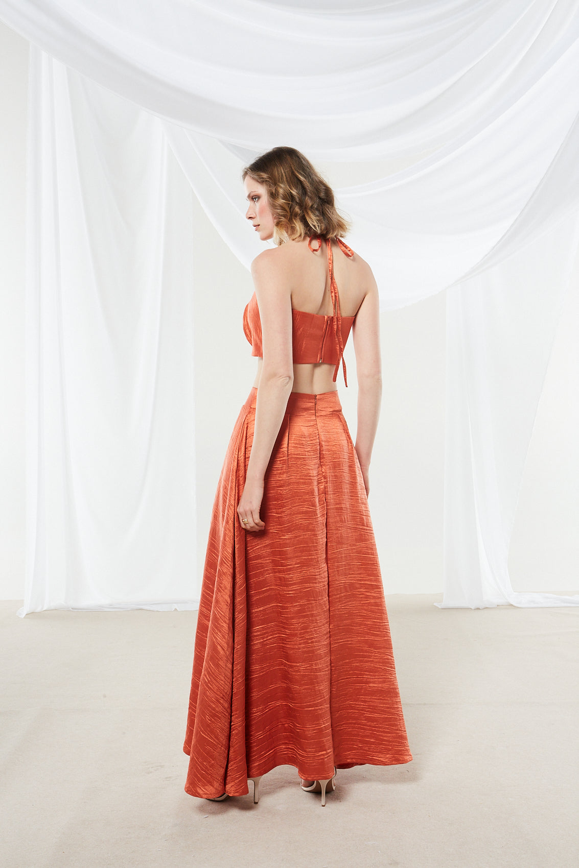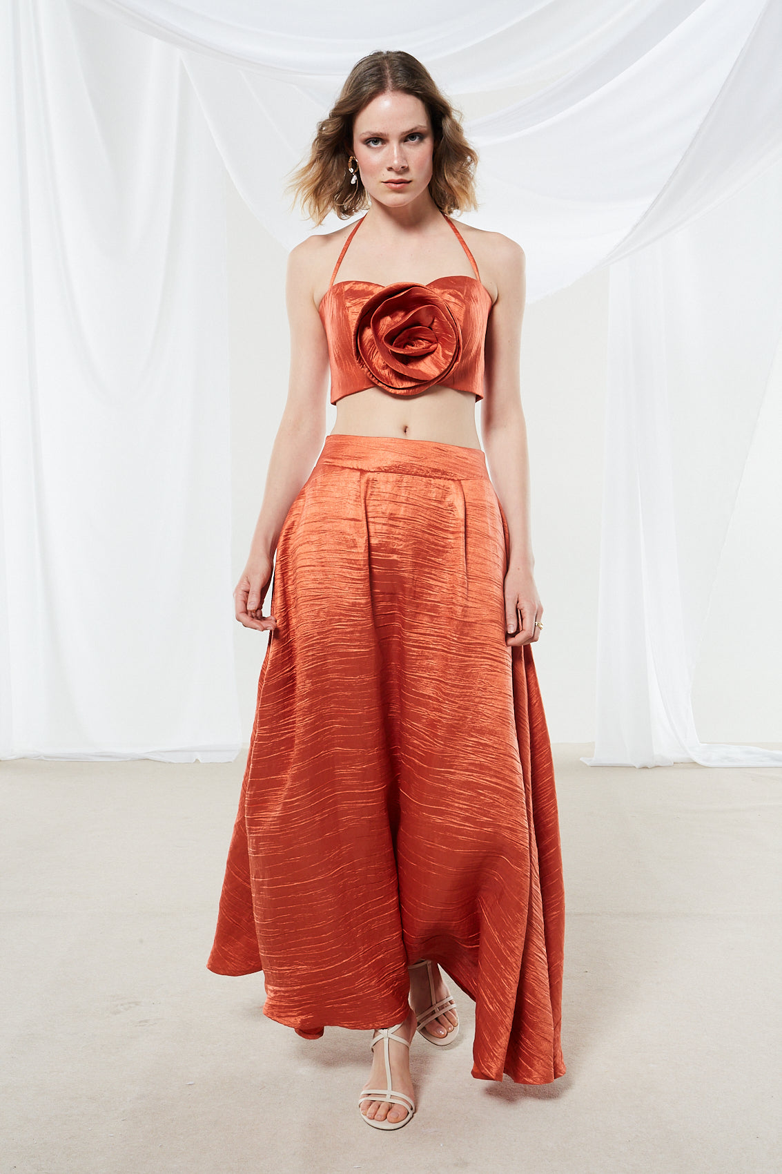 Step into elegance with this two-piece ensemble featuring a rich terracotta/orange cropped halter top and a maxi skirt. The smooth, structured fabric with a subtle sheen adds a touch of sophistication, while the 3D floral appliqué on the top and front pleats on the skirt bring a romantic and polished look.
